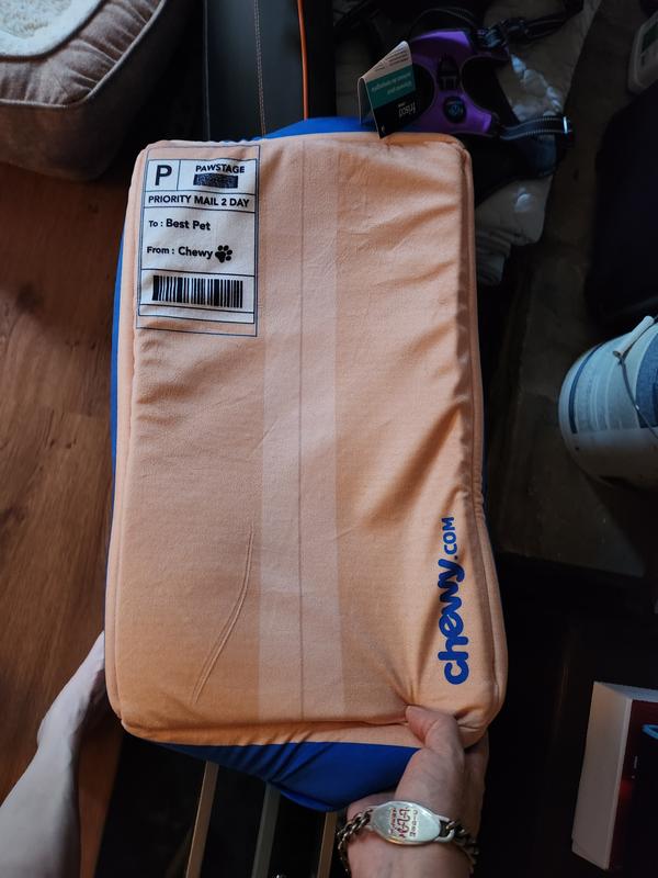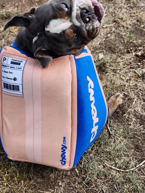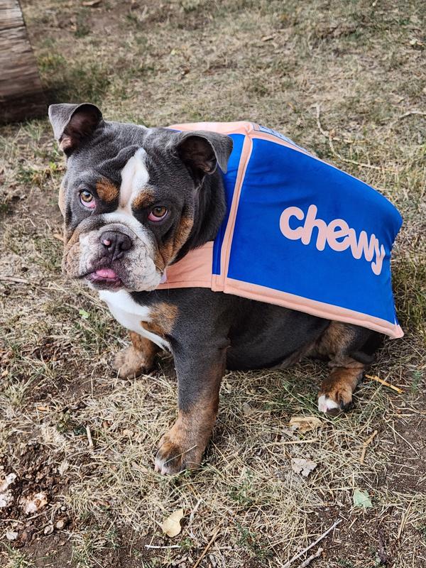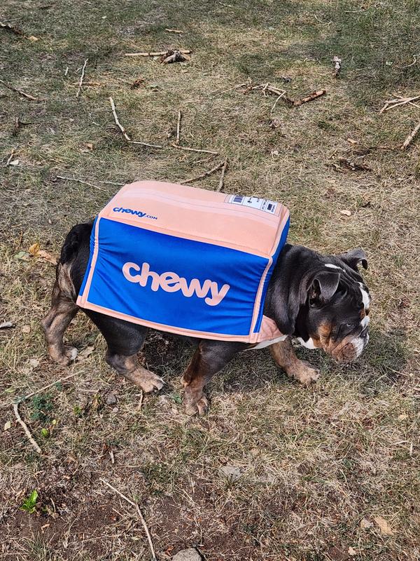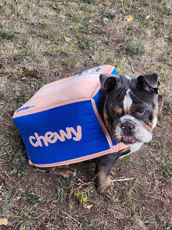 The Chewy box costume is super cute and easy to put on. The material is soft and comfortable for your pet to wear. This would be super fun to pair with one the UPS driver costumes if you have multiple pets and like to do group Halloween photos. My bulldog puppy didn't mind wearing this costume at all. It has velcro straps to customize your fit. I highly reccommend this super easy costume for a fun Halloween!