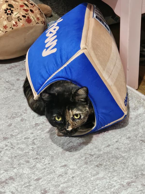 The iconic chewy box is such a cute Halloween costume. We love the attention to detail and how it even has a shipping label on it! It's easy to put on and is very secure. It does need shaped a bit before it's on, otherwise it looks like the package was damaged during shipping 🤣