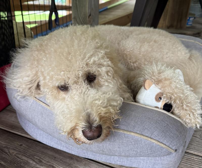 Received this adorable plush dog toy with squeaker. Instant hit with my 2 toy poodles. They seem to take turns tossing it around. My bigger toy poodle loves to