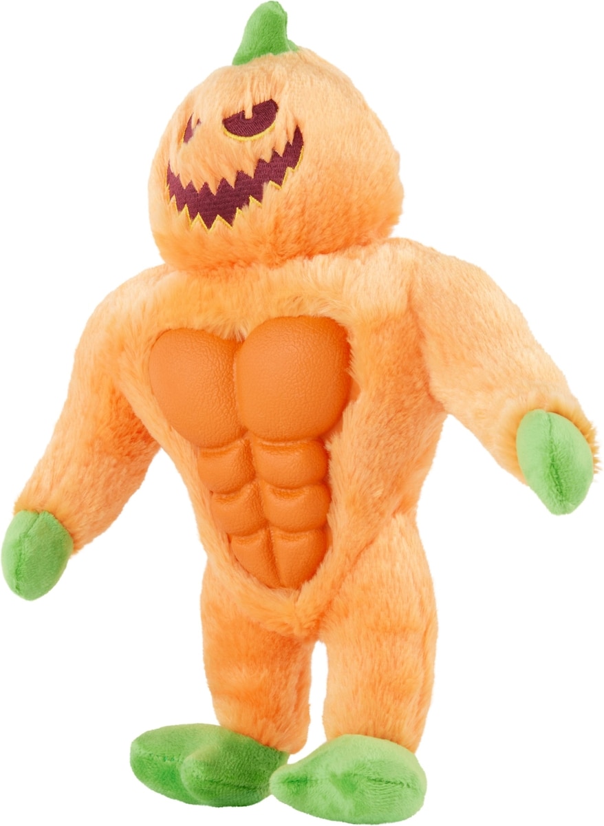 - This pumpkin muscle plush dog toy features four squeakers, soft textures and TPR "muscles" to upgrade playtime for hours of games.