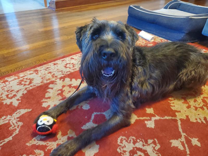 Thunder is a German Shepherd that loves balls and loves penguins, this pengu ball couldn't be any better! It bounces it squeaks all the fun needed