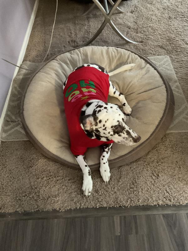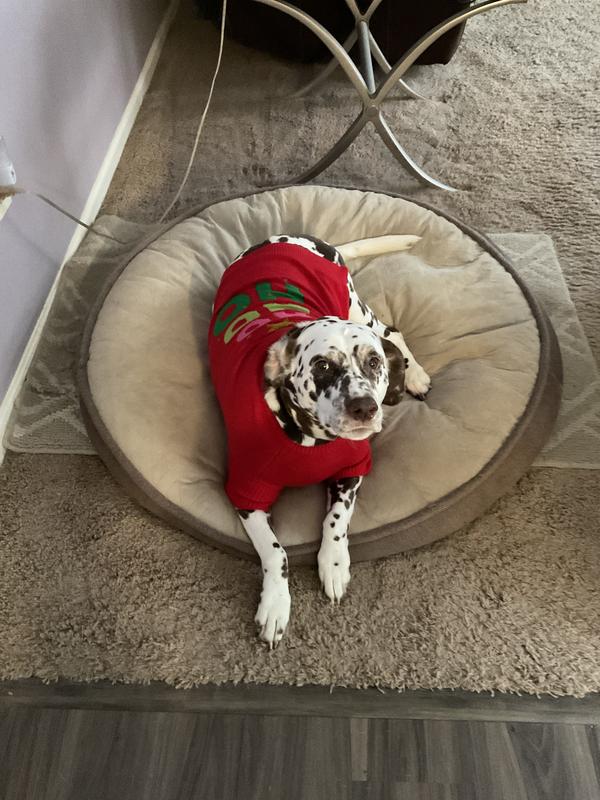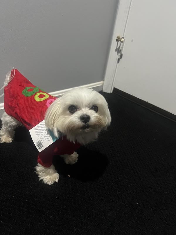 Perfect Fit and Adorable Holiday Sweater! I got this holiday red sweater with “Ho! Ho! Ho!” on the back for my mini dachshund, Oscar, from Chewy and it’s absolutely perfect! The size small fits him just right — he’s 12 lbs — and he has plenty of room to move comfortably. The quality is excellent and soft, and the design is adorable. Oscar usually tries to wiggle out of his clothes, but not this one — he loved it and didn’t want to take it off! This is by far the best-fitting sweater he’s ever had. Highly recommend!