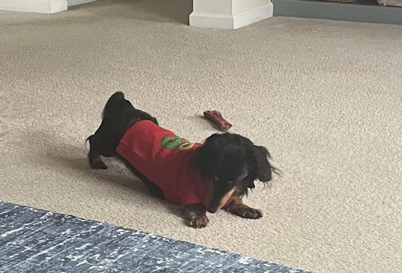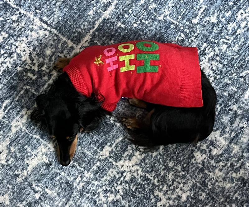 Perfect Fit and Adorable Holiday Sweater! I got this holiday red sweater with “Ho! Ho! Ho!” on the back for my mini dachshund, Oscar, from Chewy and it’s absolutely