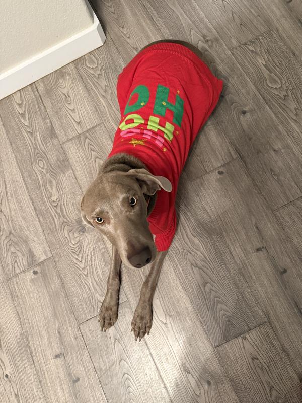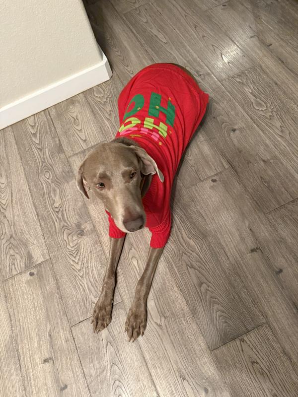 Adorable red HoHoHo sweater that fit Opal perfectly. Thick and very well made, this goes on our Christmas card! My very busy Weimaraner seemed to love it, no objection to wearing it and it looks so darned cute💕