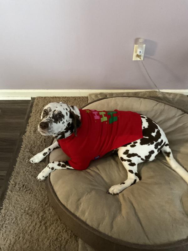 I love the Frisco Holiday Ho Ho Ho Sweater for my dalmatian, Penny. It was easy to put it on her. The sweater fit her perfectly. It must have been comfortable, because