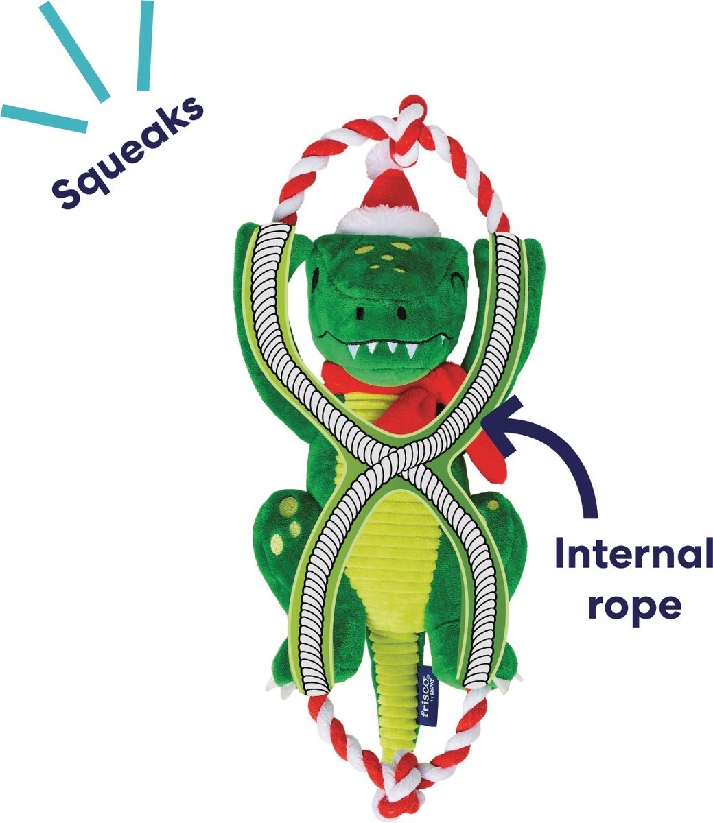 Frisco Holiday Plush with Rope Squeaky Dog Toy, Dinosaur, Medium/Large