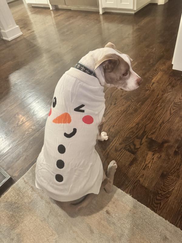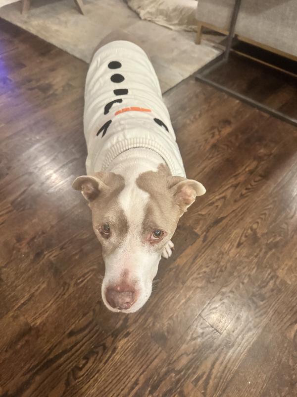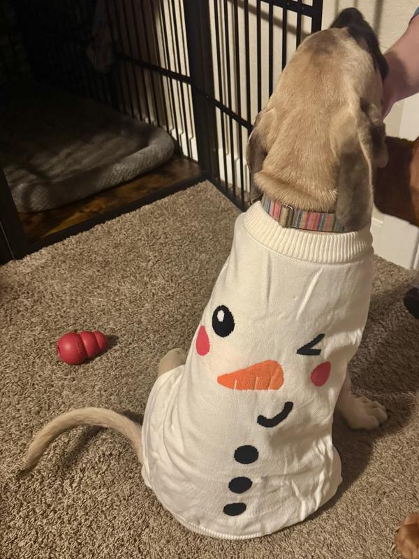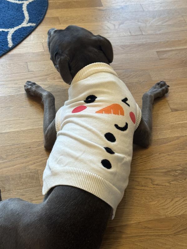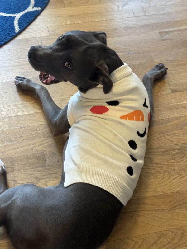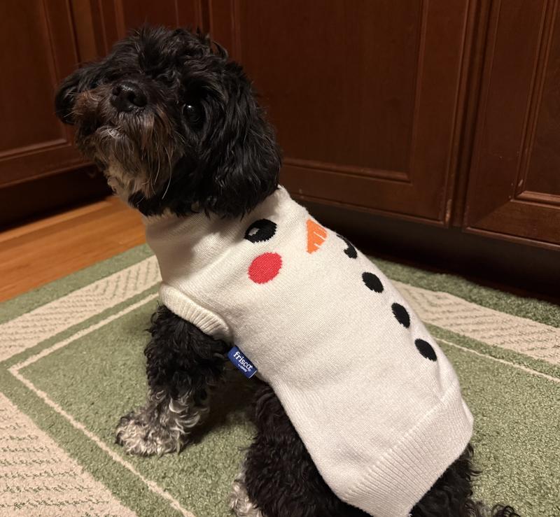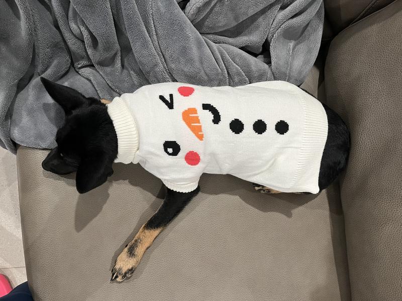 I love this snowman dog sweater! The quality is fantastic — very well-made with great attention to detail. It was a little smaller than I expected when I first put