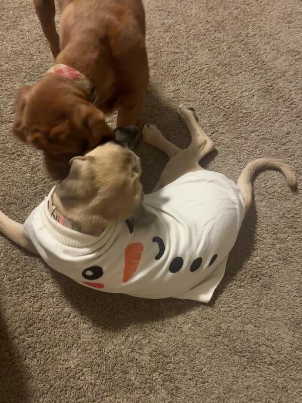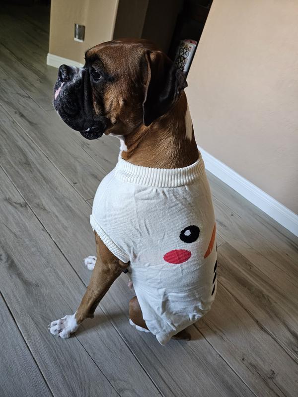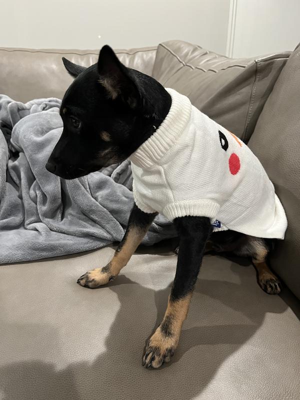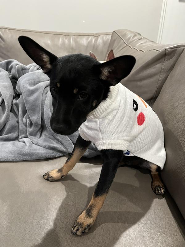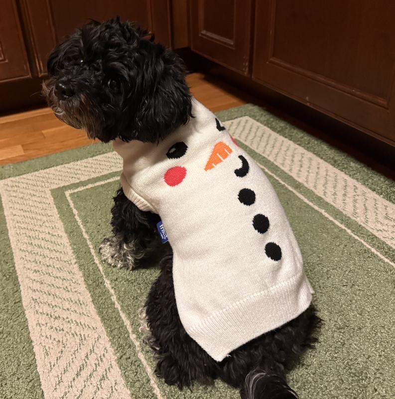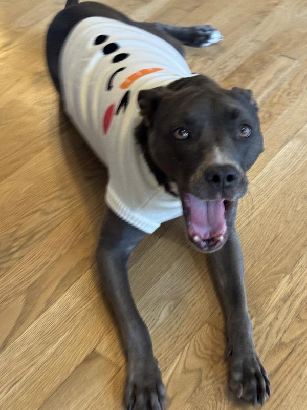 I love this snowman dog sweater! The quality is fantastic — very well-made with great attention to detail. It was a little smaller than I expected when I first put
