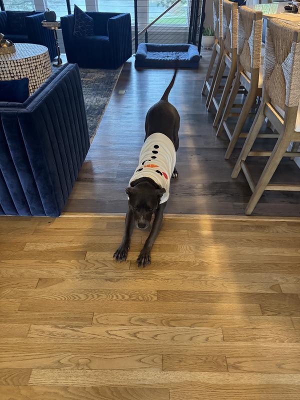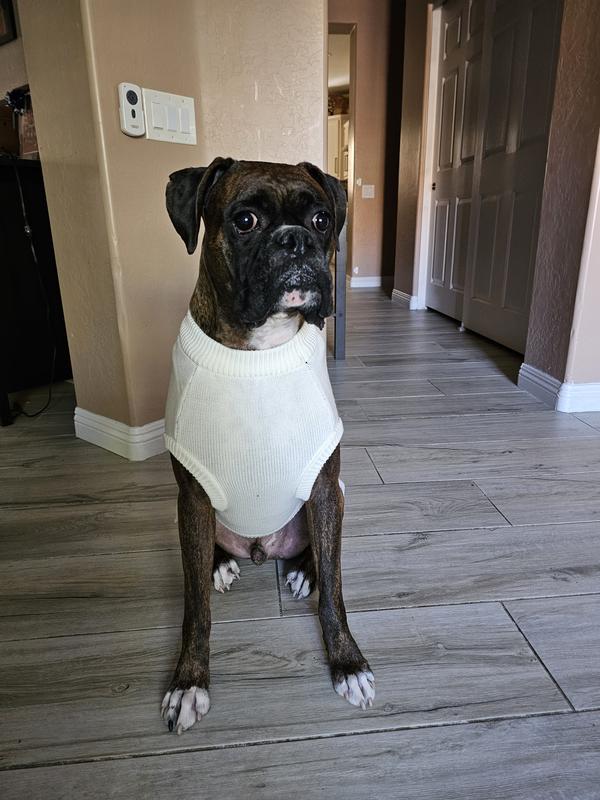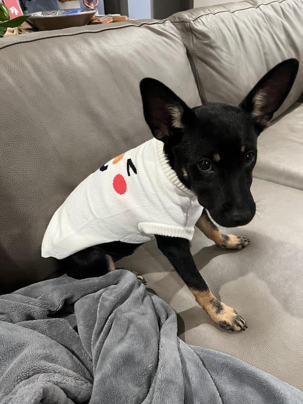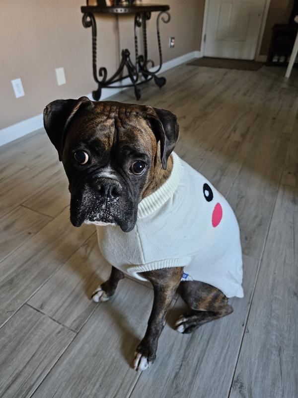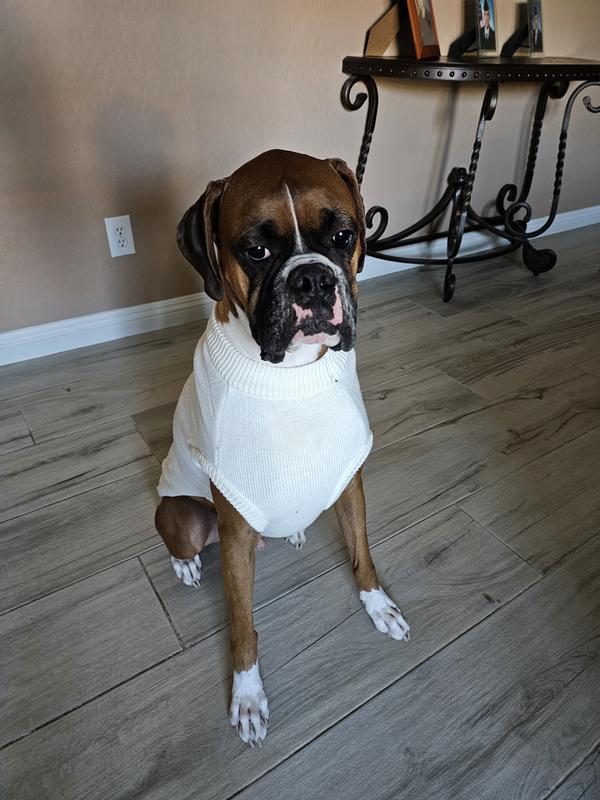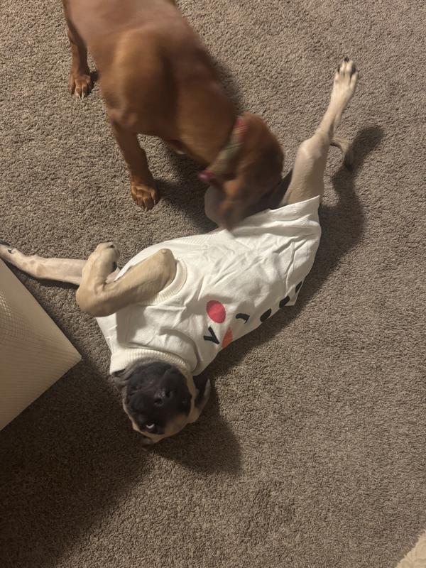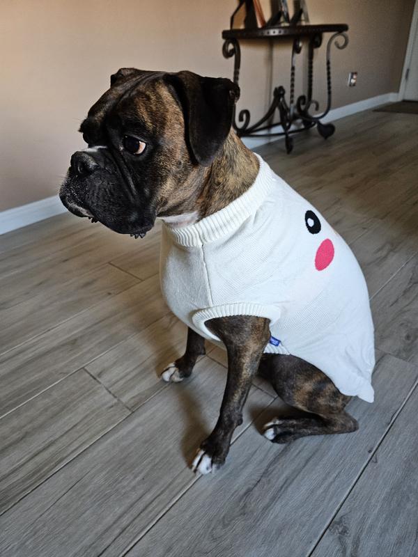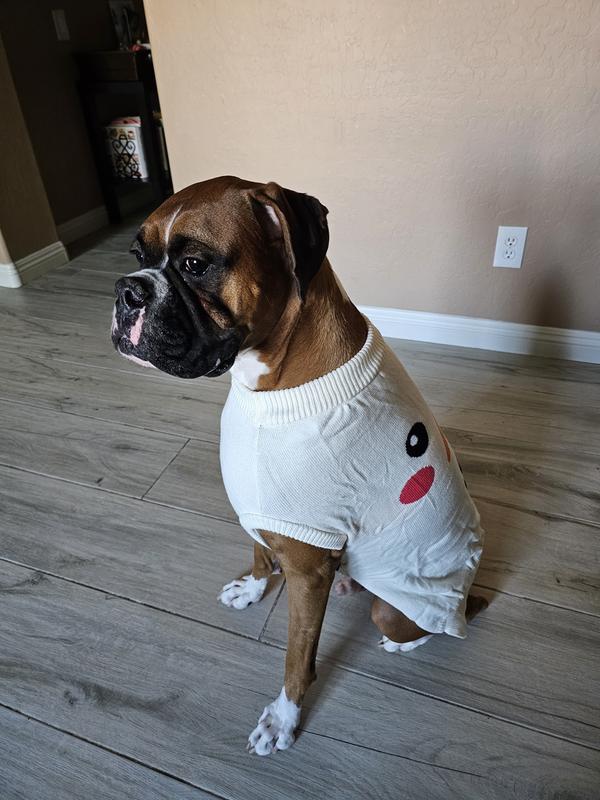 This sweater is really well made and super cute and festive. The best part was it fit both of our boxers really well, even in the chest area, which is where most