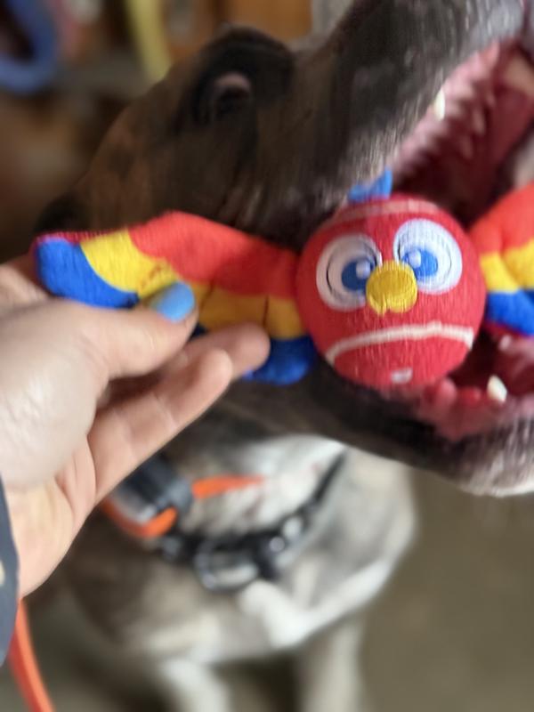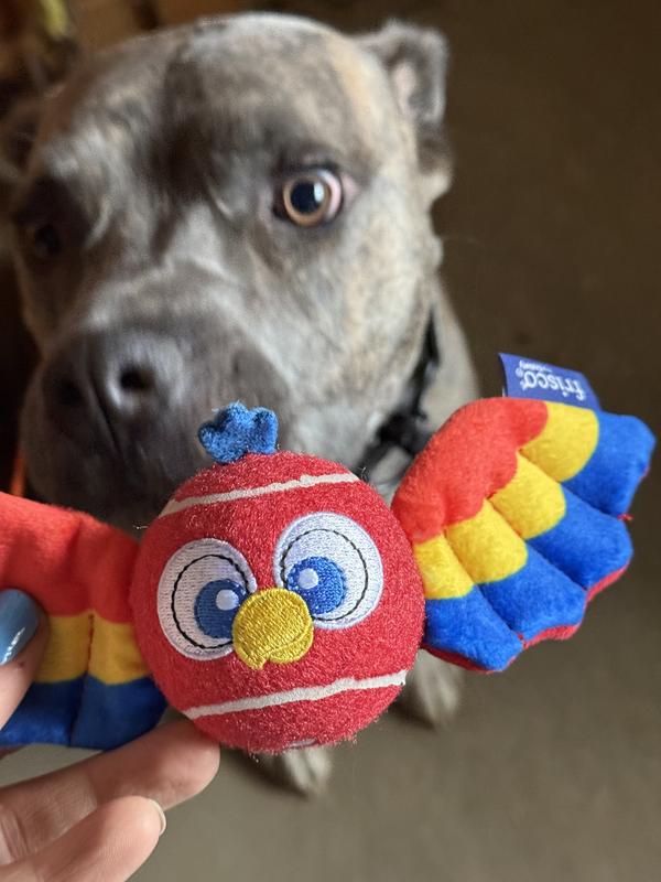 - Combines all the allure of a tennis ball with a colorful plush toy, including crinkle paper in the wings and parrot-beak detail.