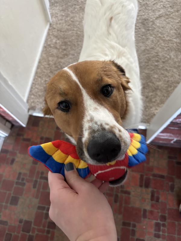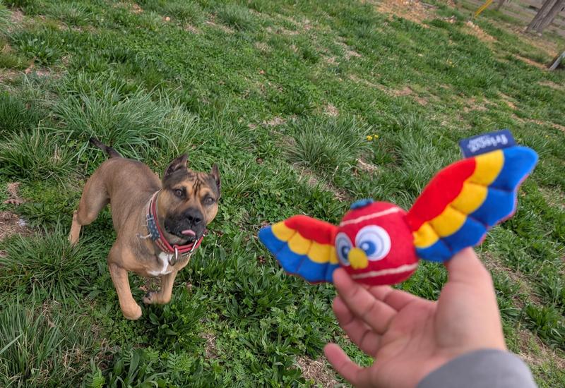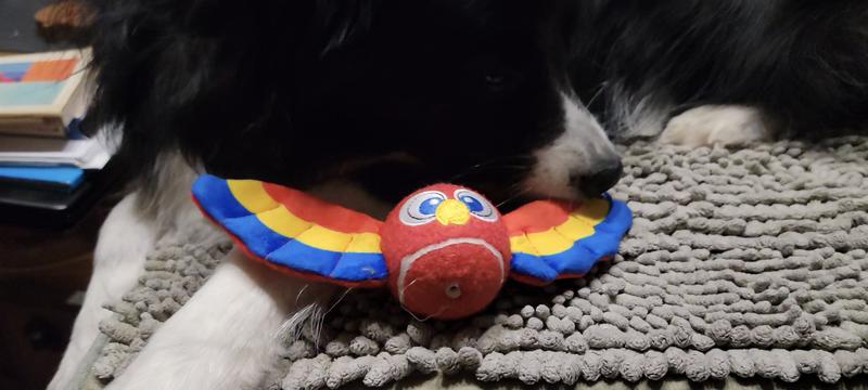 This is an adorable toy, and I was really happy that my dog liked it, and it's the perfect size for my dog. I have a 35lb., 5-year-old Border Collie female who has never. ever. ever wanted to play with a ball and she is not toy driven. Unlike most Border Collies, my girl would not chase a ball or bring it back at all. I was thrilled that I could toss this and she would bring it back by the wings. She was even willing to play a little tug with it. The ball does squeak...a plus for my girl. Her prey drive kicks in and the wings add to the prey picture. I'm not sure if she likes the crinkly wings but I certainly do. Because the ball has wings, you can aim the toy where you want it to land. We played both indoors and outdoors. The wings make the toy very easy to see in the grass. Looking forward to having my girl have more fun fetching and tugging the Frisco Summer Parrot