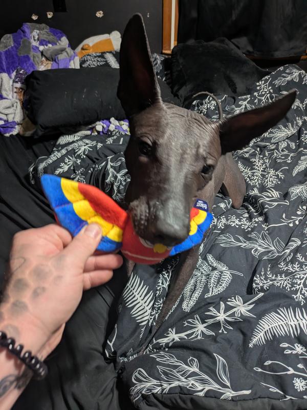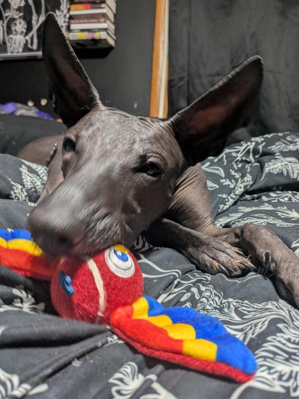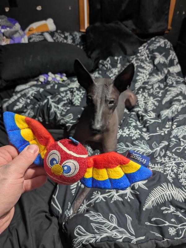 I originally got the Frisco Summer Parrot Fetch Squeaky Tennis Ball for my little dog, Potato Chip, because, well, he deserves nice things. But my Xoloitzcuintli,
