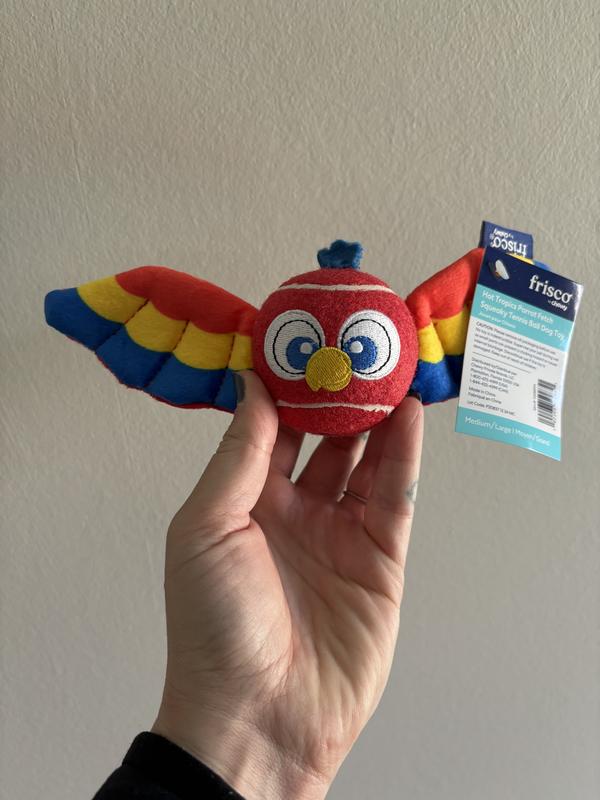 - This tropical parrot tennis ball toy gives the standard fetch toy a boost of exotic color, a squeaker, and a pair of soft, plush wings.