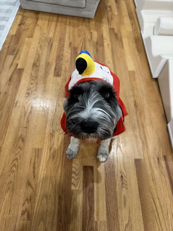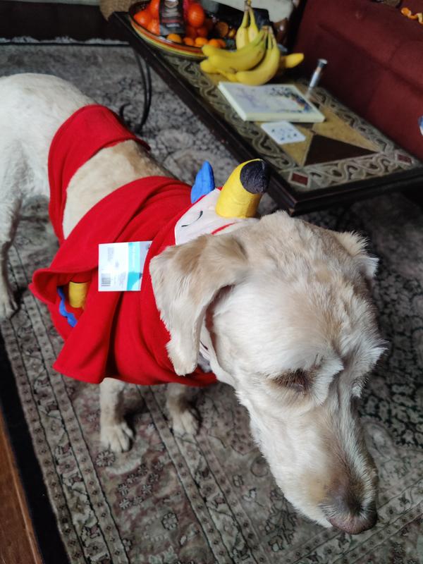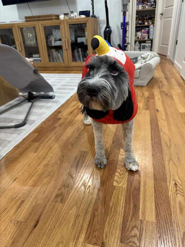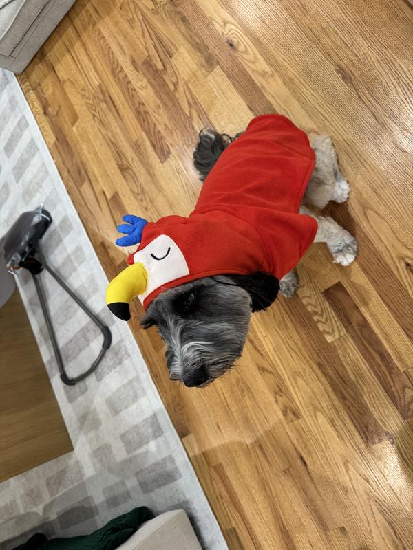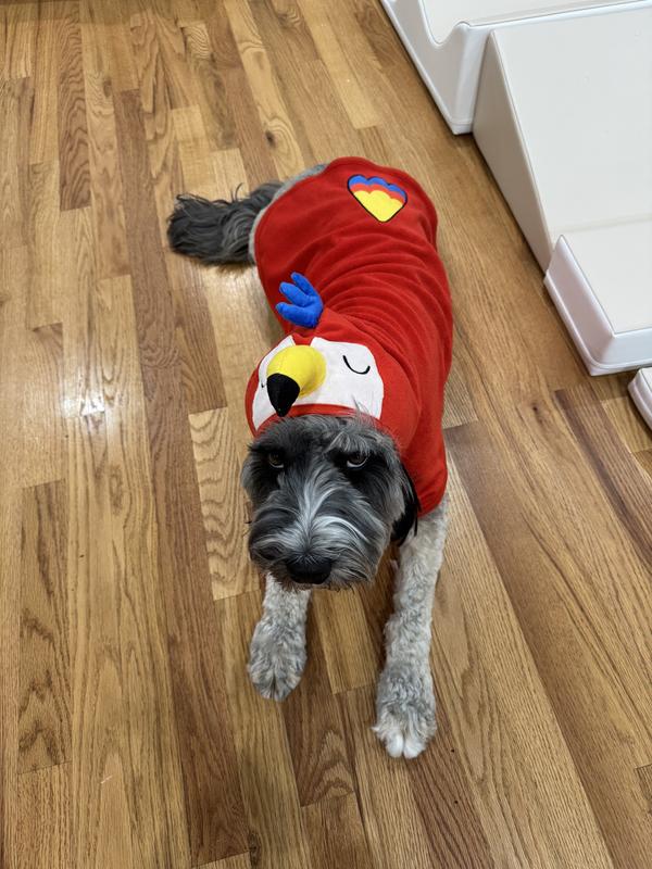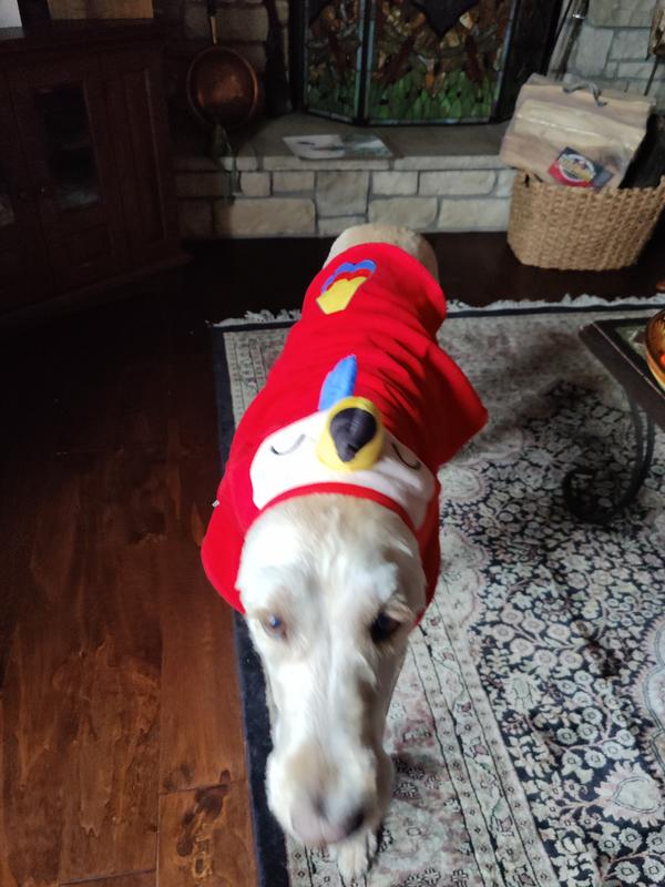 While the macaw design is cute, the robe doesn't stay in place on my dog. There is a velcro strap around the abdomen which holds it on, but the hood/beak part doesn't stay up unless it covers my dogs eyes. His forehead is too small. While it may work on other breeds of dog, there is no way to keep the hood up for more than a few seconds with my labradoodle.