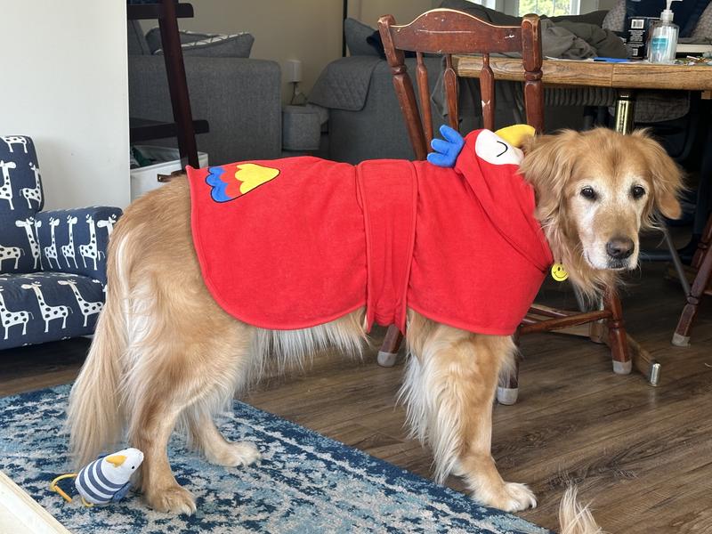The Frisco Summer Macaw dog bathrobe, first and foremost is simply the most adorable pet product I've ever seen. I've used it after bath time and intend to use it