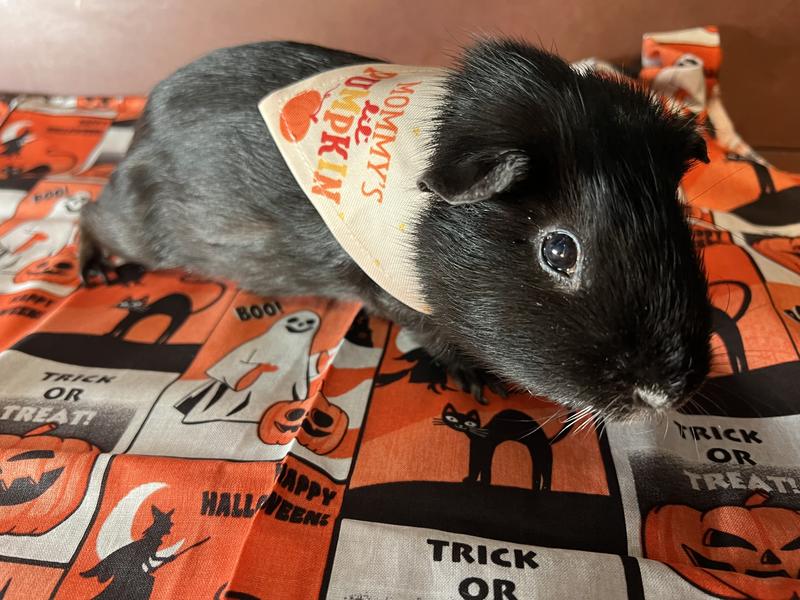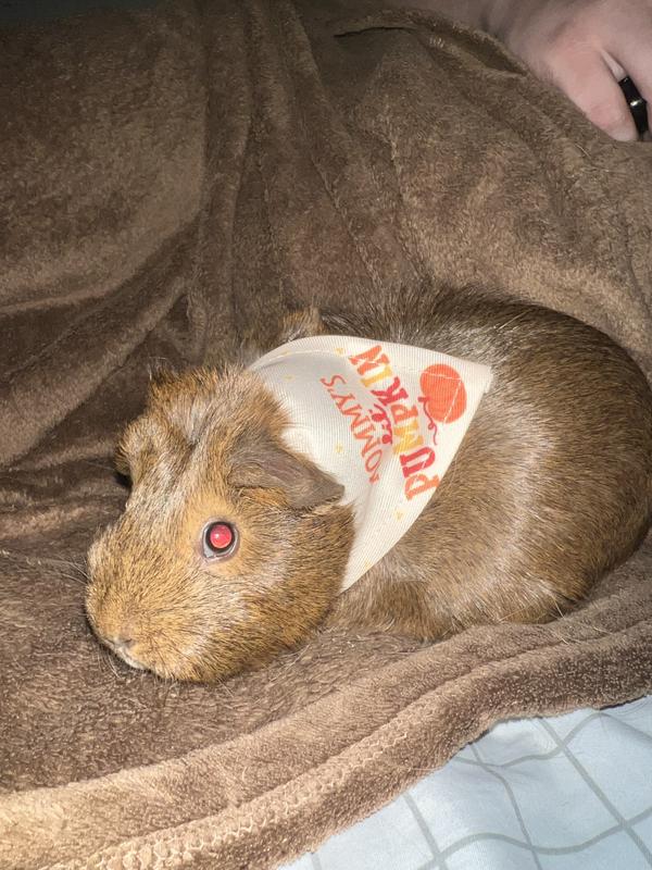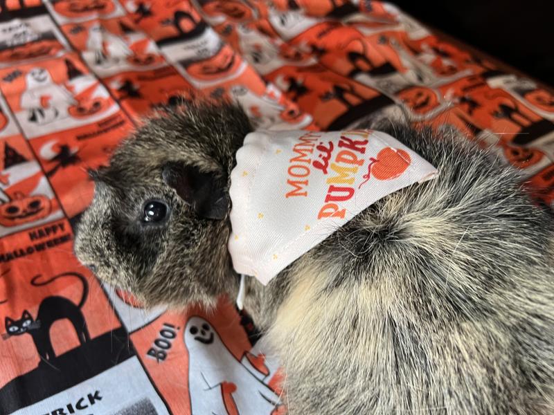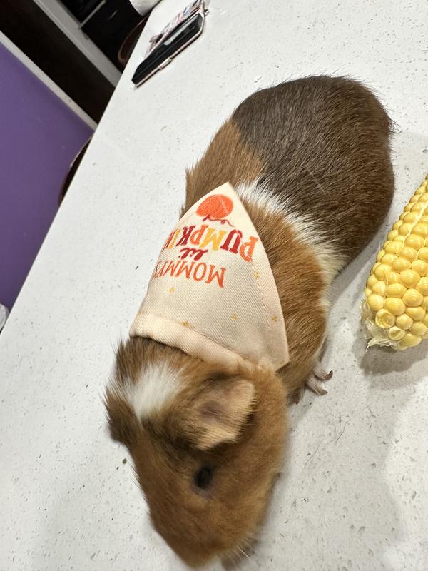 This teeny tiny bandana is SO cute! It fit my guinea pigs perfectly and I love that the tie for it is stretchy. I was able to size it on the one and not have to untie to place it on the other thanks to its bungee quality. Now even my guinea pigs can be stylish for fall photos.