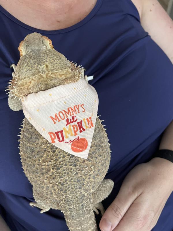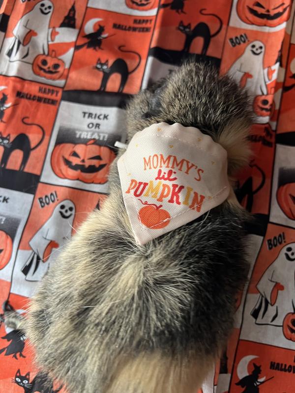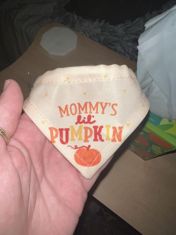 - Small pet bandana comes in tan with a cute lil’ pumpkin on the front and reads “Mommy’s Lil’ Pumpkin.”