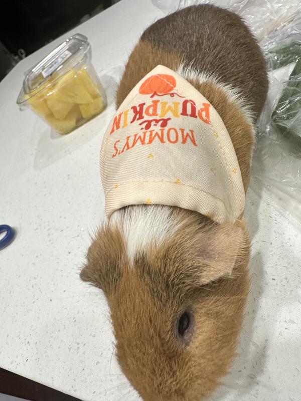 Obviously cute for fall time pictures! It fit super well on my two guineas and they truly seemed like they didn’t mind having it on. It is too small for my larger breed bunny, but it did fit my goffin cockatoo- although he didn’t like wearing it too much. I really like that the cloth is movable on the stretchy band as well.