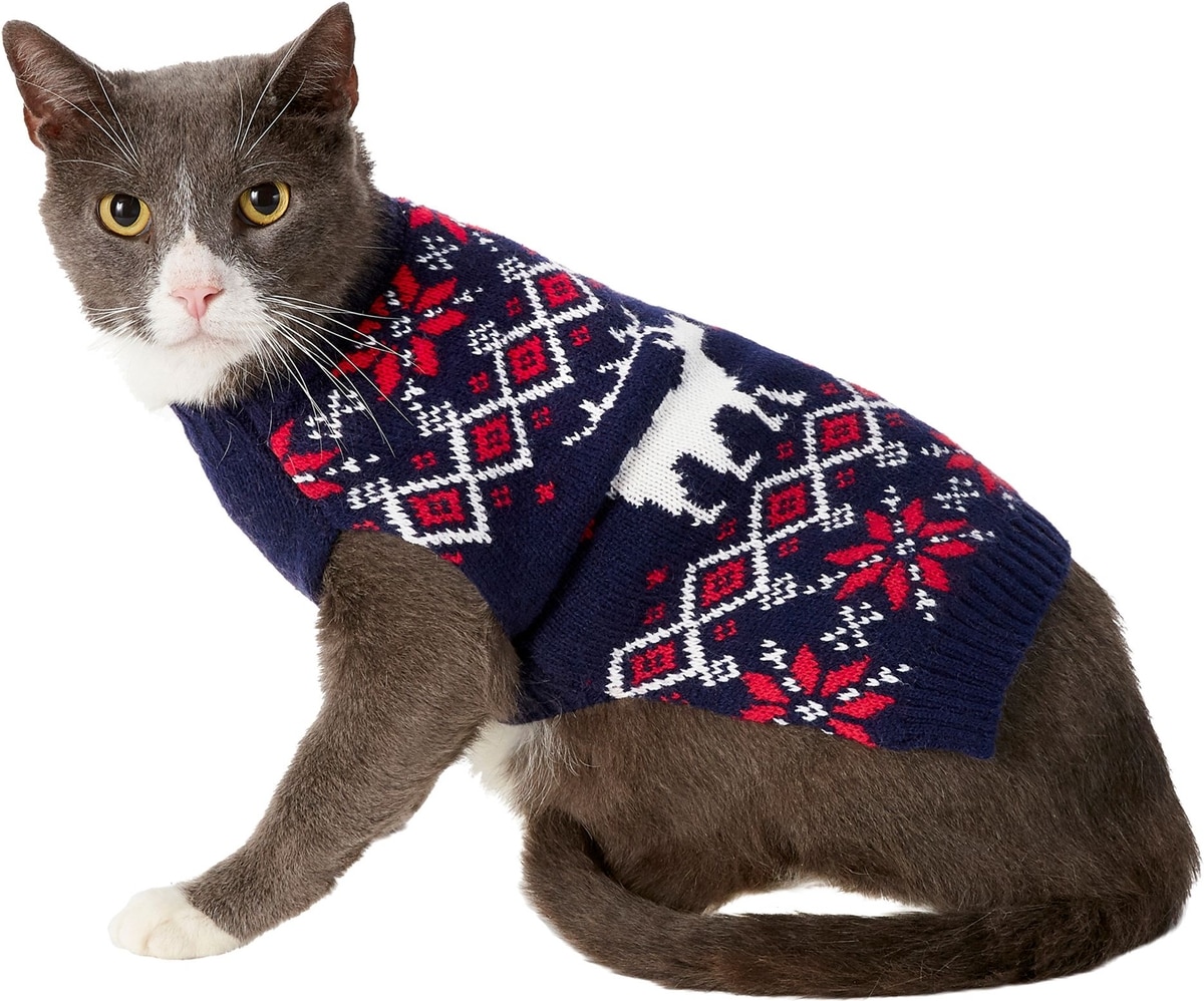 • The classic Fair Isle style pet sweater gets a moose upgrade for a unique holiday look.
