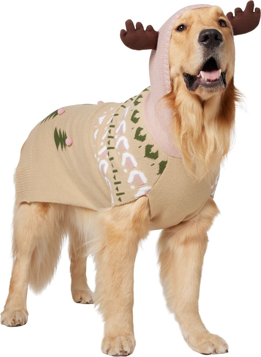 Fits nicely following the size guide. Cozy for chilly walks with a cute holiday knit. Great price, and appears well made. The antler hoodie will make for nice Christmas pictures but are a bit too heavy and floppy to stay up on their own.