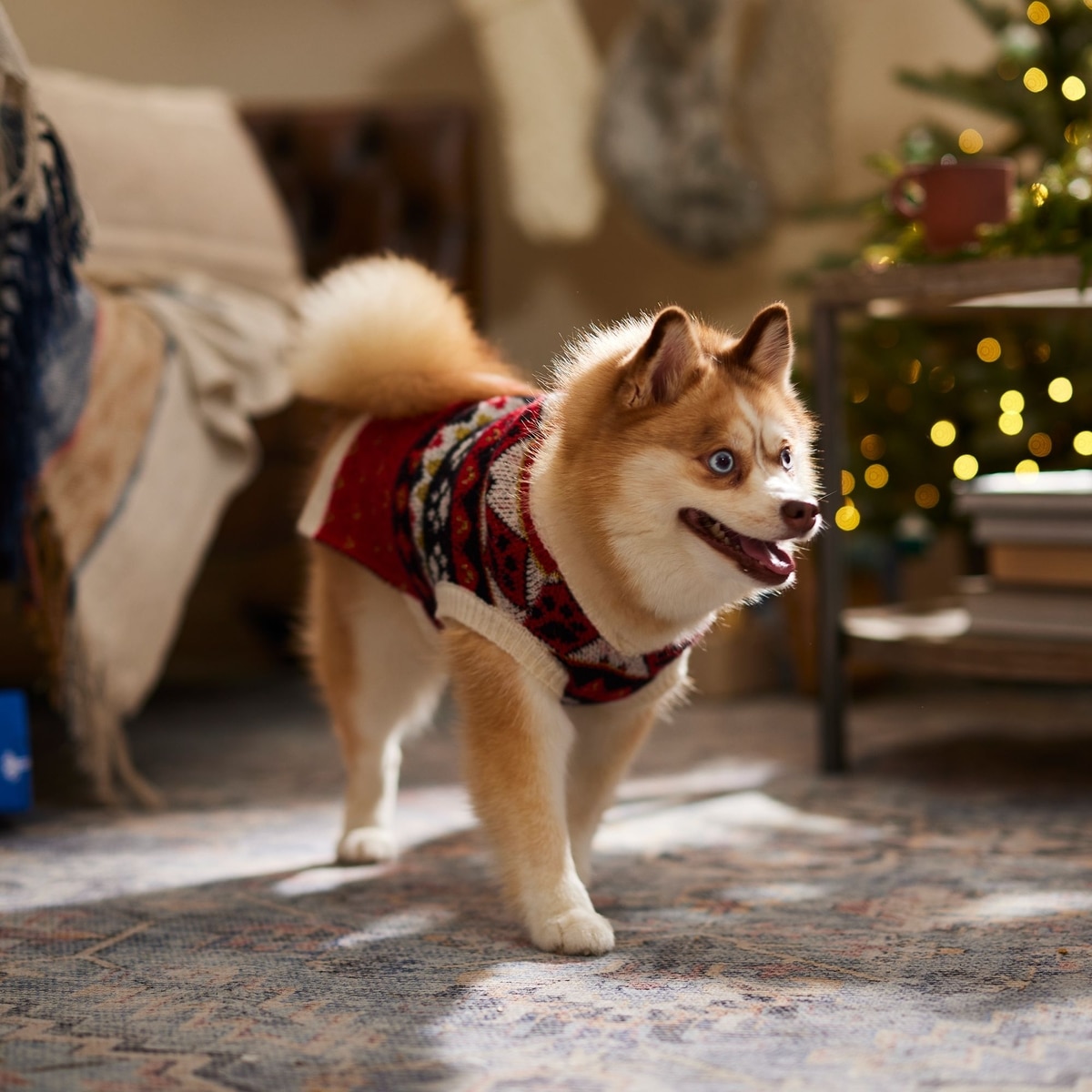 • This knitted pullover sweater features a Nordic-inspired pawprint pattern with sewn-in metallic gold accents for added flair.