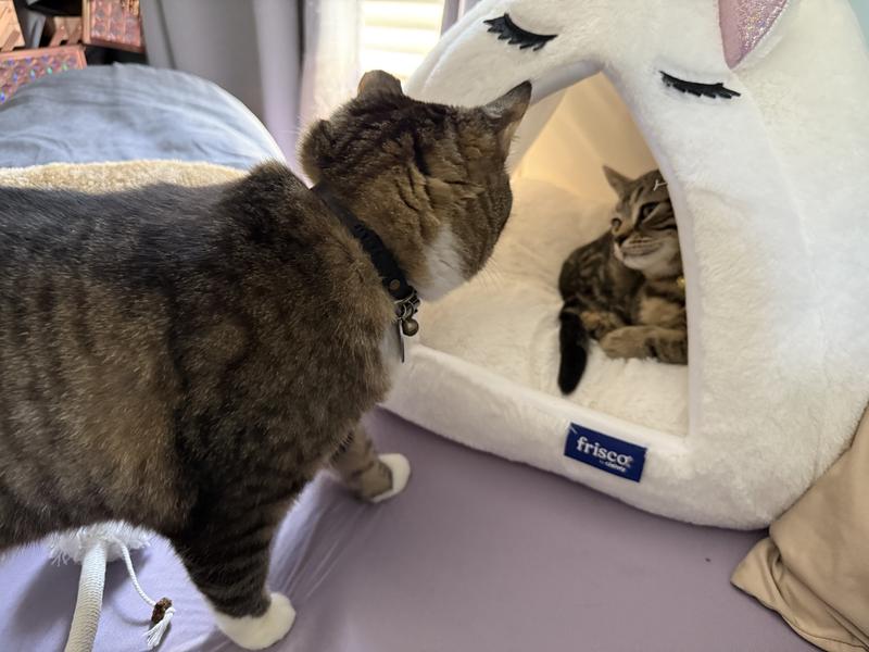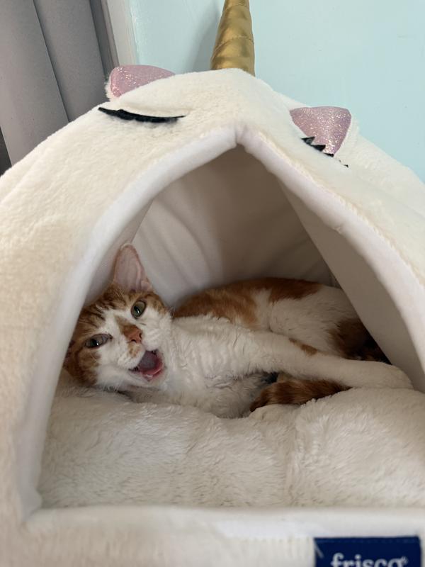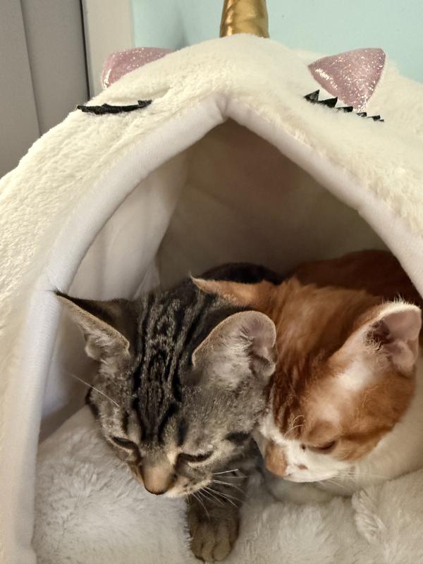 My cats are obsessed with this unicorn. I bought it so they would have a cozy place under my desk while I work. It’s the perfect size for adult cats. The inner padding