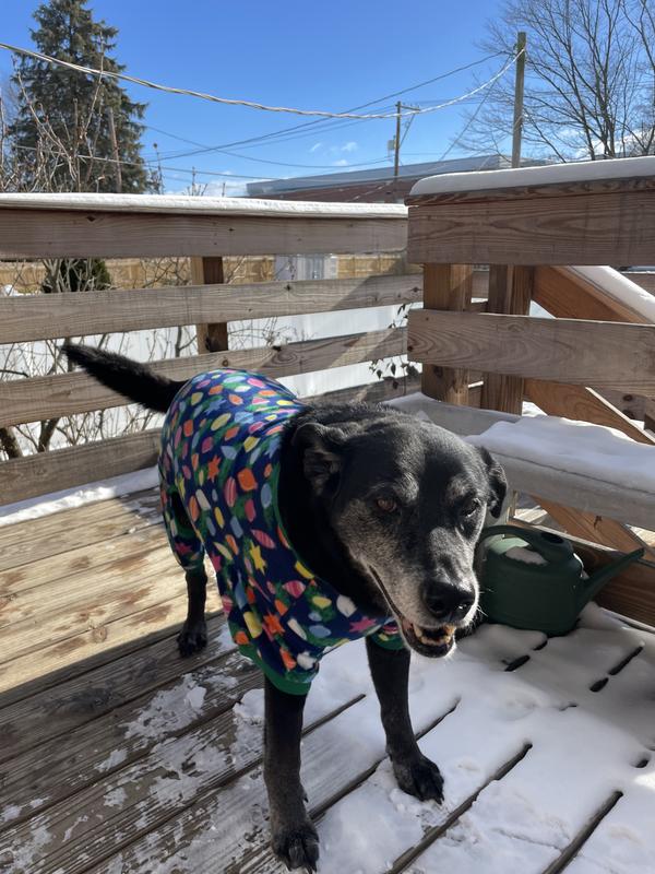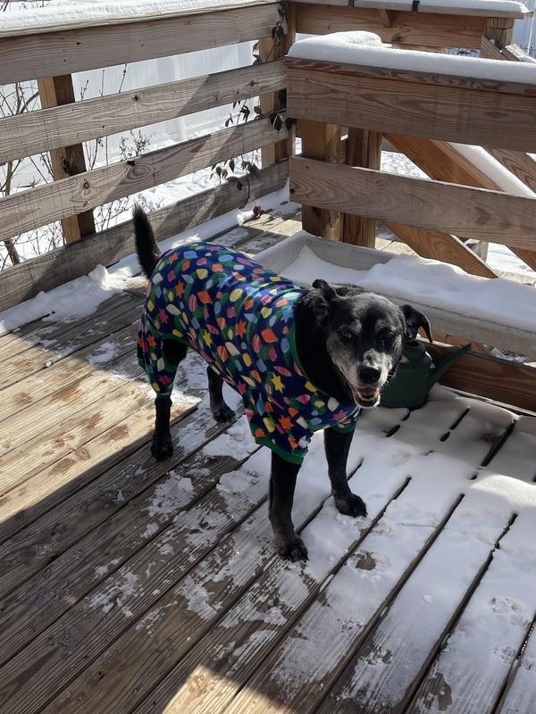 • These warm, polar fleece pet PJs feature a printed pattern of holiday ornaments to get your pet feeling the festive cheer.
