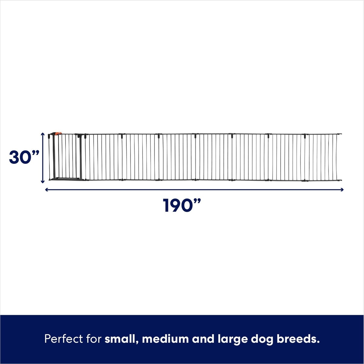 - Each panel stands 30 inches tall, with the gate being able to expand across 186.5 inches without mounting brackets. Make that 190 inches with the brackets.