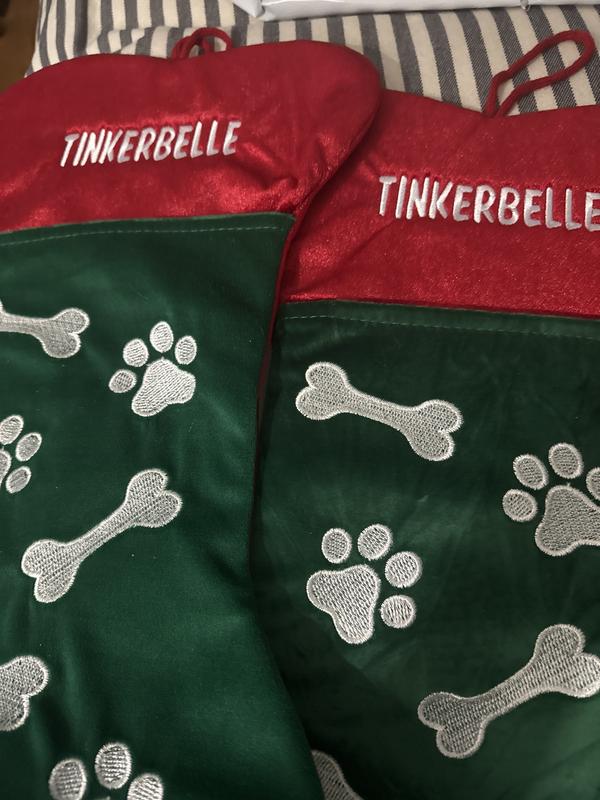 - Stocking features embroidered white lettering on a red-and-green background with bone accents and white pawprint shapes for that holiday touch.