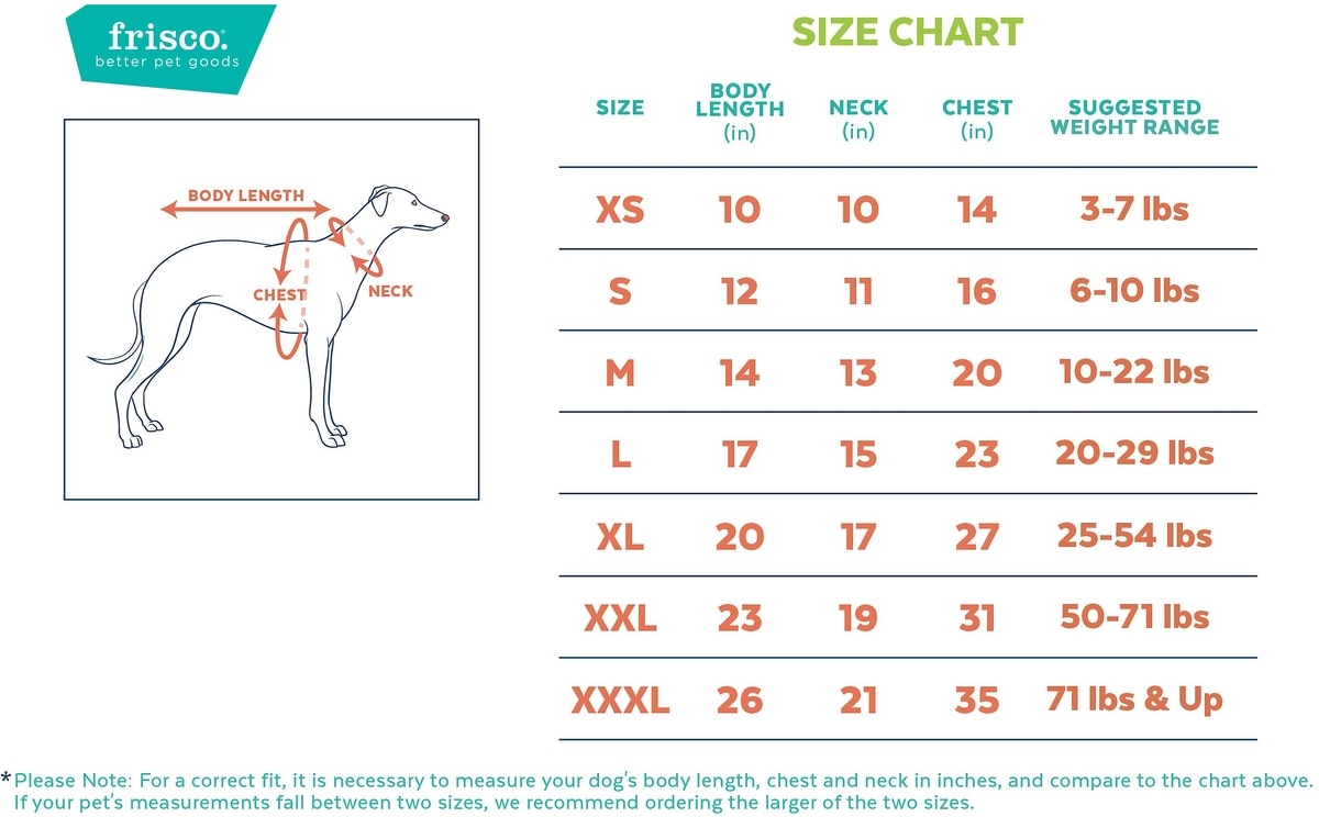 For the best fit, we recommend measuring your pet and matching your pet's measurements as closely as possible to the sizing chart. To measure your pet's body length, measure the base of the neck to the base of the tail. To measure the neck girth, measure around your pet's neck leaving room for two fingers and to measure chest girth, measure your pet's chest around the widest part. If your pet falls somewhere between two sizes, we advise ordering the larger of the two. For the complete sizing chart, please refer to the photo below or click the “Size” tab, next to the “Instructions” tab, just under the product photos.
