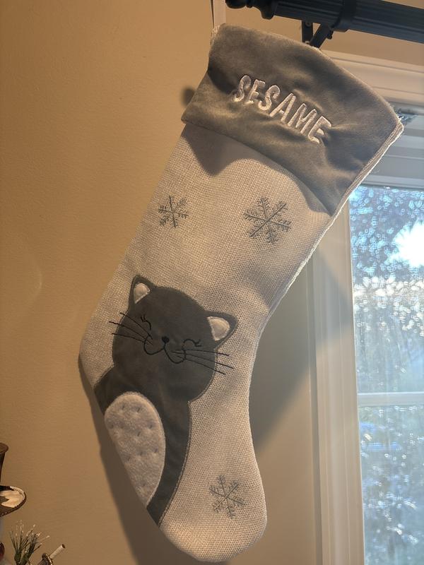 - Grey polyester stocking is designed with a smiling cat and little grey snowflakes for an extra pop of winter cuteness.