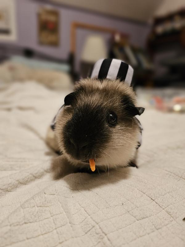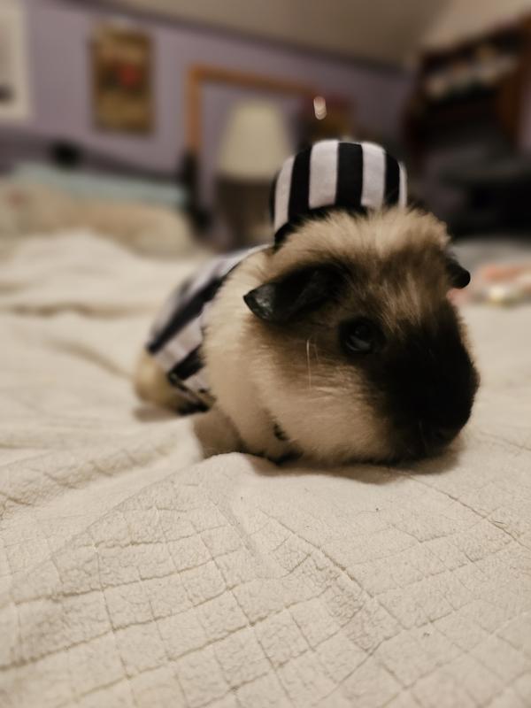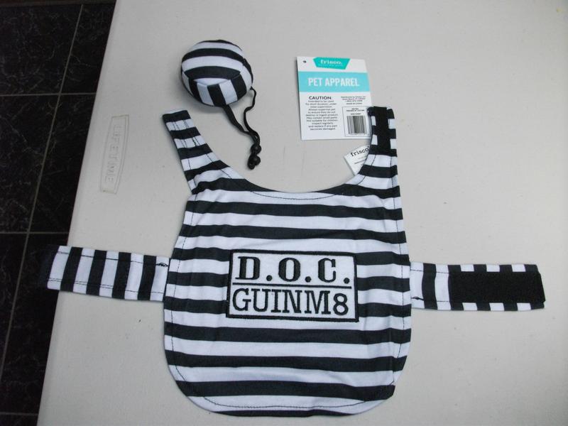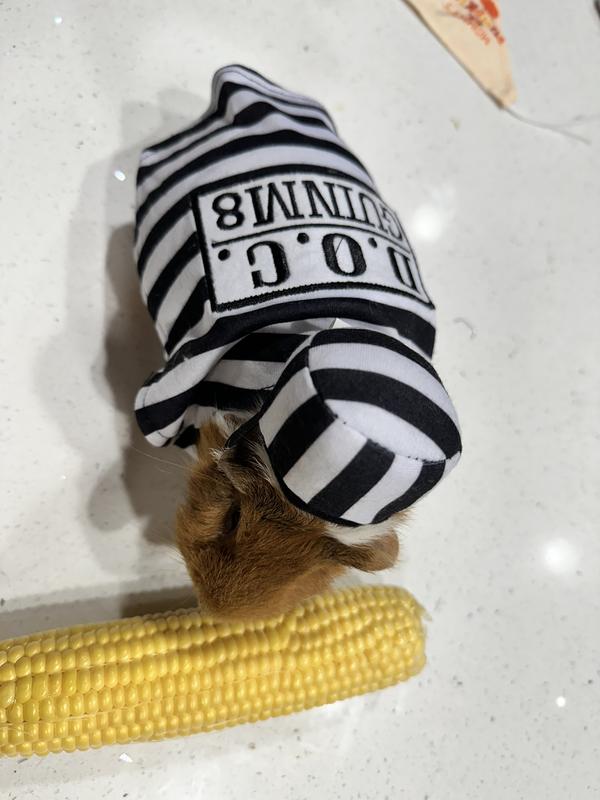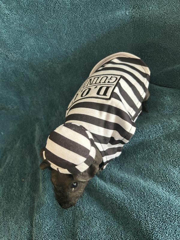 Too cute for prison! This prisoner costume for guinea pigs is full of cute details. From the little pill hat to the DOC information on the back, it is a really nice costume. It uses velcro to attach the sides across the belly, and then velcro again to attach the pieces across the front (below the guinea pigs' throat). The hat uses elastic and a plastic squeeze device to adjust it to the right size. Although the front closure on the outfit was too wide for my guinea pigs (one is 2.5 lbs, the other 3 lbs), the flexibility of the fabric meant that I was able to appropriately adjust the velcro to ensure it stayed on. Neither Popcorn nor Peanut were able to remove the outfit, and they seemed fairly comfortable walking around in it. They were not as fond of the hat, but if you put the elastic strap behind their ears, it stays put and they forgot it was there. This is a cute outfit that has a good fit, and it got a lot of laughs from my friends!