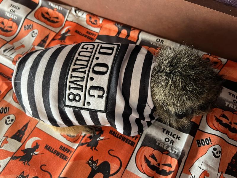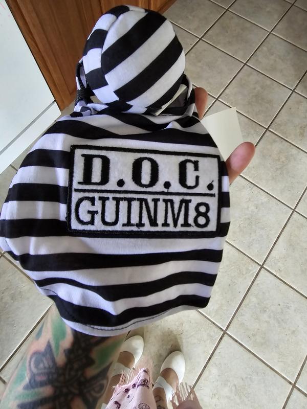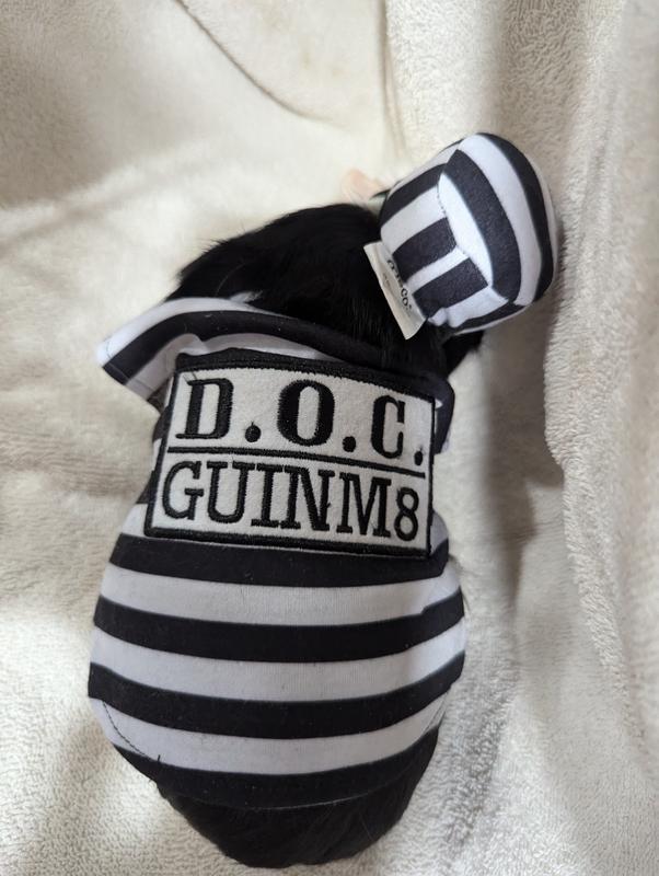 Too cute for prison! This prisoner costume for guinea pigs is full of cute details. From the little pill hat to the DOC information on the back, it is a really