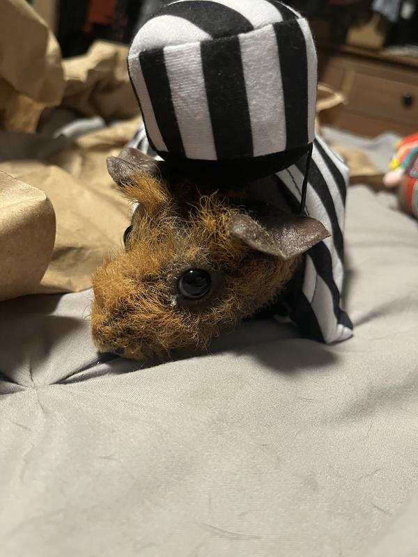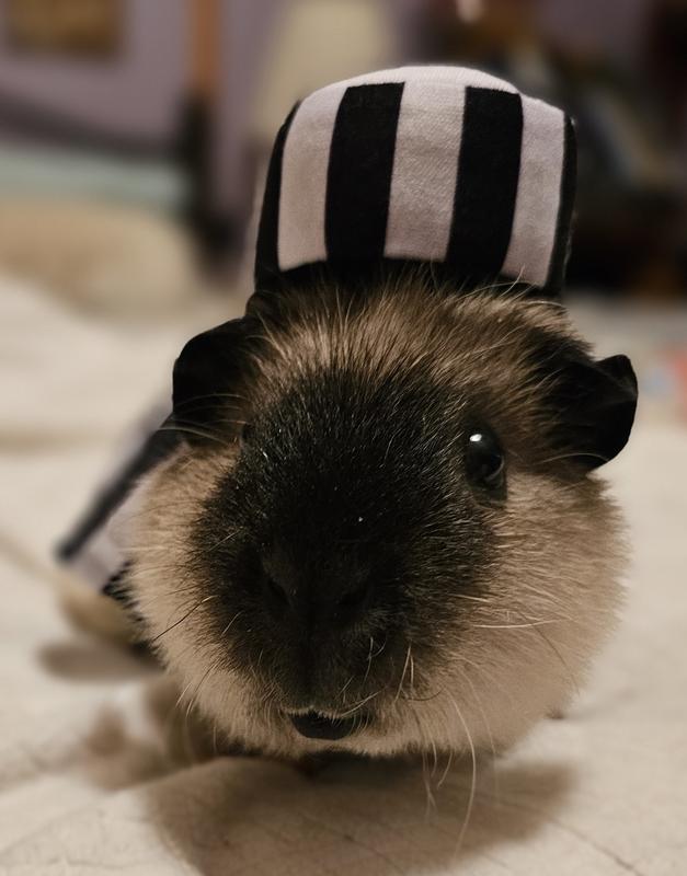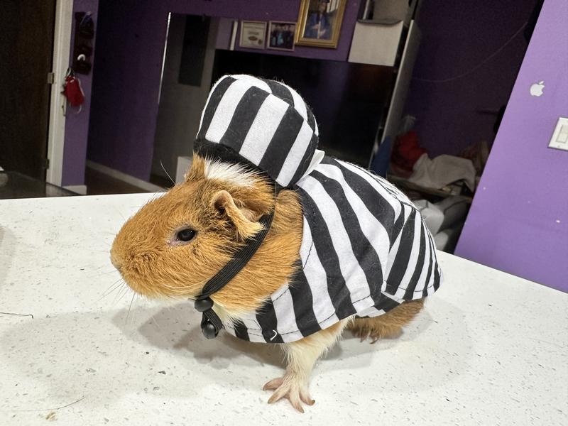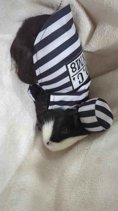 One thing that I have loved about these costumes is how adjustable they are. The couple of costumes that I have gotten in the past tend to be too small for my guinea pig. But he does make a innocent looking jailbird.