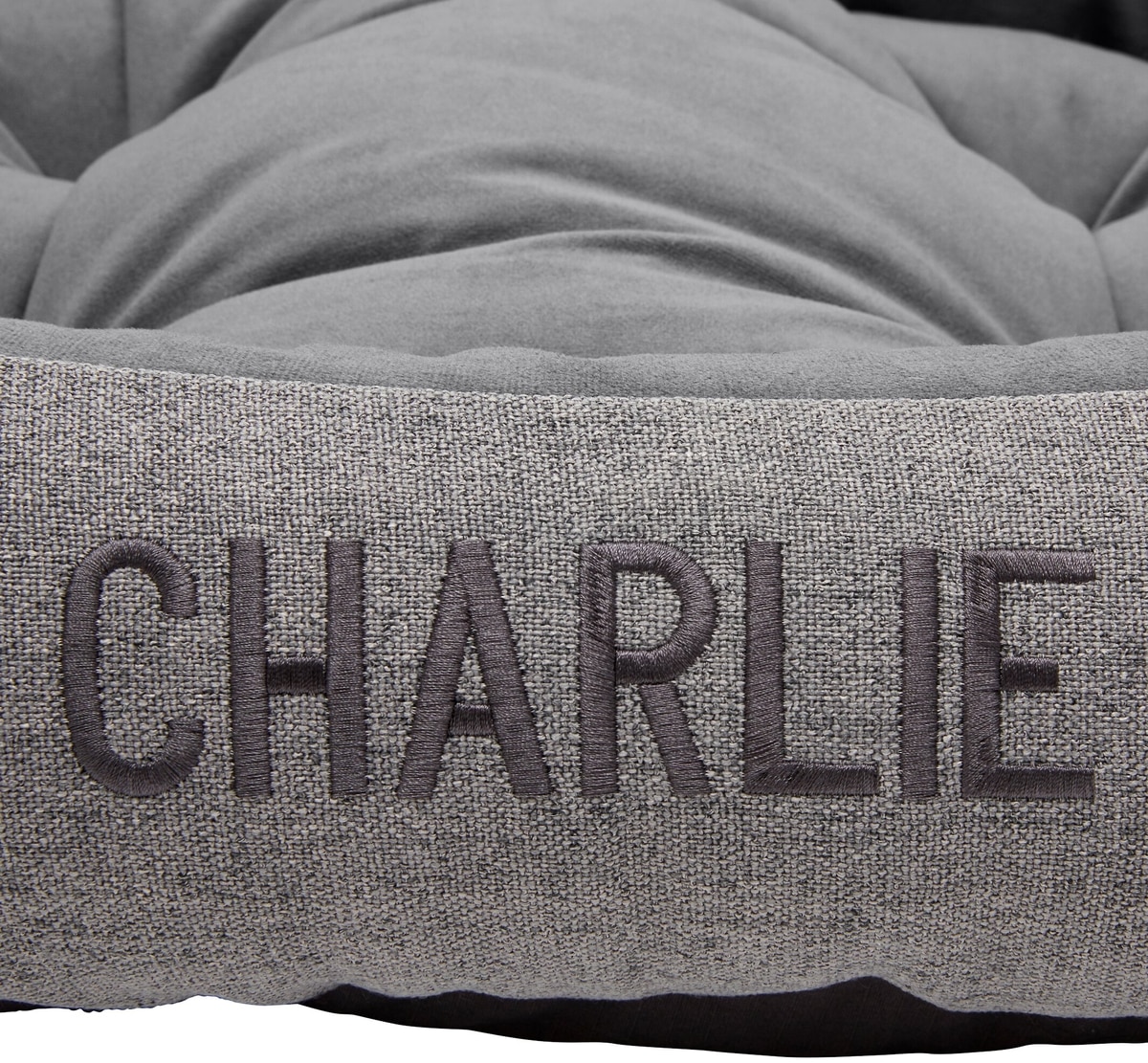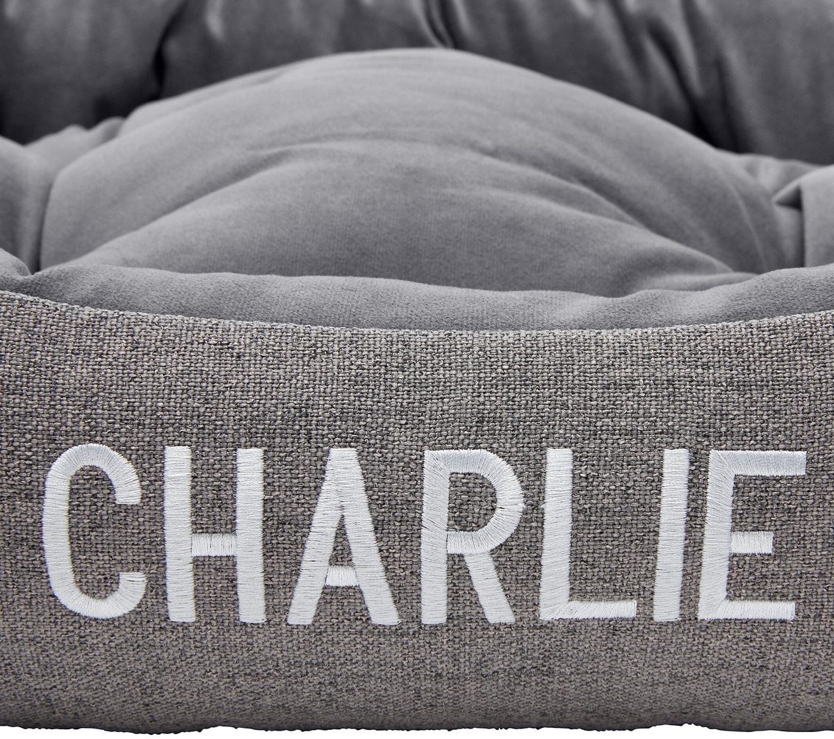 This bed can be customized with your pet's name, up to 10 characters. Color thread and font is also customizable.
