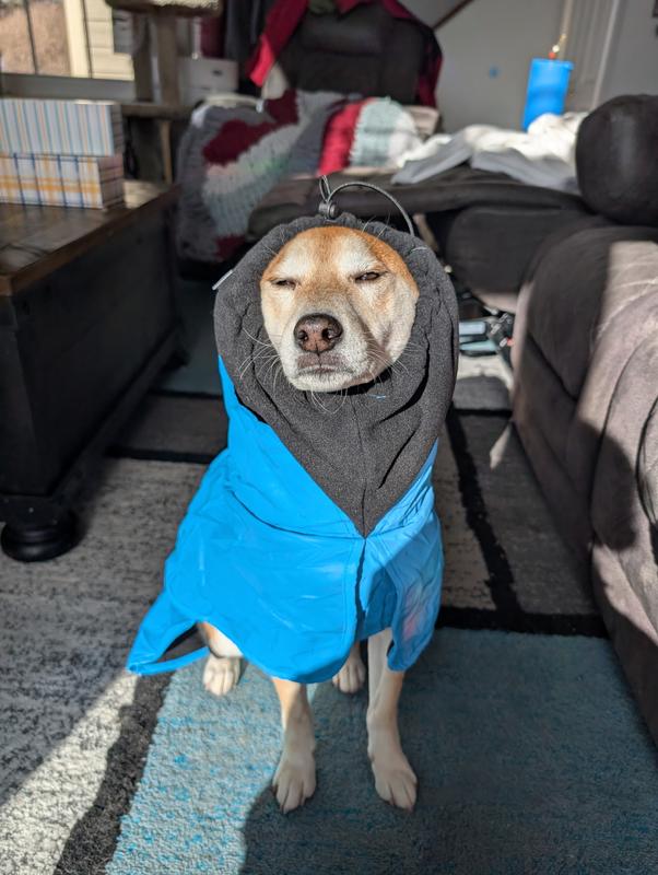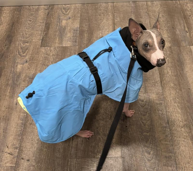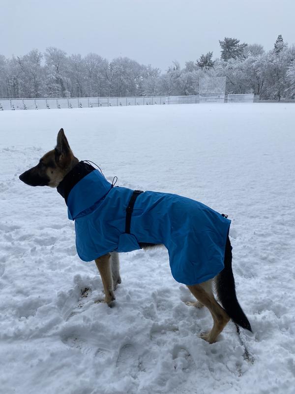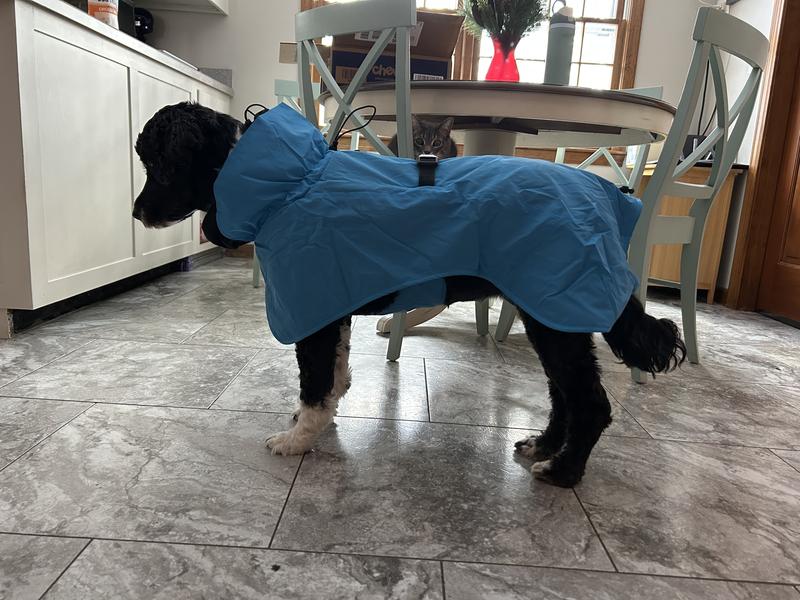 This coat is great quality, easy to put on and stays on/stays in place well with the areas you can cinch! He likes wearing it and will even take a nap in it. Perfect for drizzles or snow! Bonus - it fit out harness/leash clip without having to cut a hole like we normally do! We got a large, he’s 7 months and about 30 lbs so he’s got room to grow but I like that it’s adjustable.