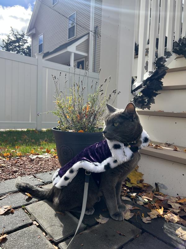 • Printed, spotted faux fur at the trim and collar of the cape add regal detail while the hook-and-loop closures at the neck and belly make it easy to secure a comfortable fit for a variety of pet shapes.