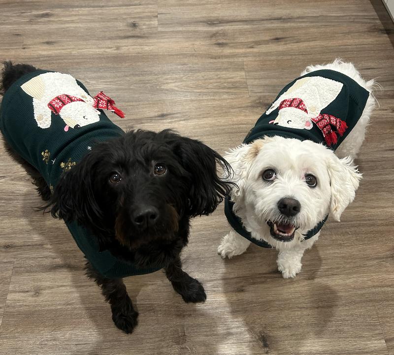 This is an adorable deep green sweater. The gold sequins add such a pretty pop of color. I ordered a L for both of my girls because I like them to be longer (reaching the end of their body) and not so tight. To help others with sizing- they are both 25 lbs, one is a mini-labradoodle and one is a cavachon (size of a larger cavalier).