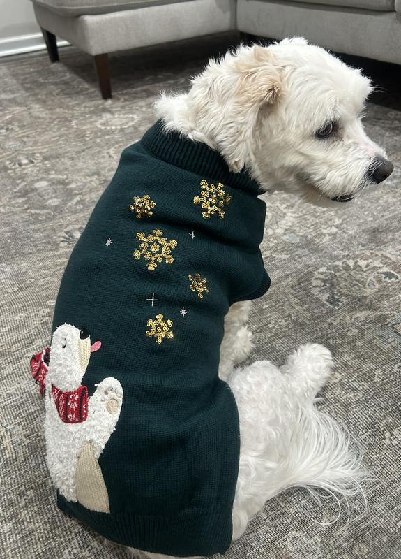 • This pullover pet sweater features a fuzzy, knitted polar bear with a fly-away scarf and sparkling sequin snowflakes.