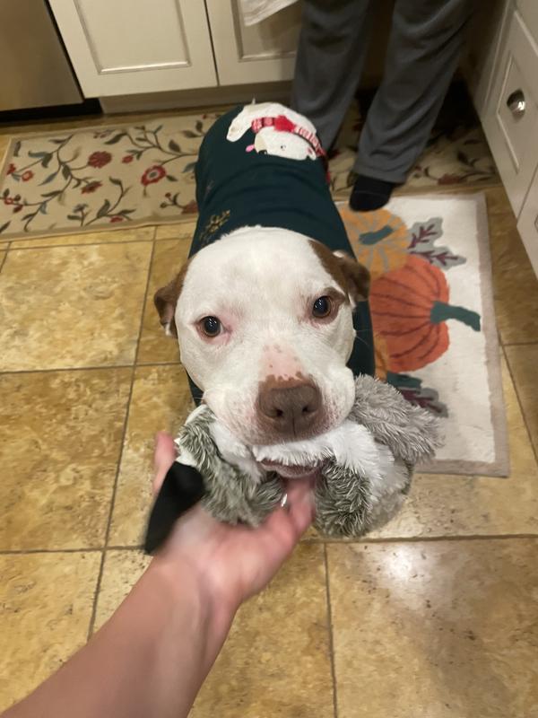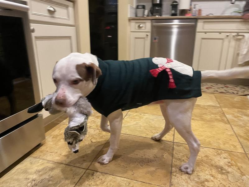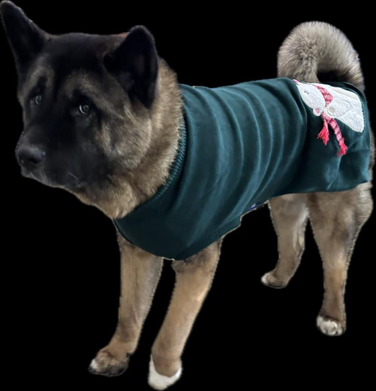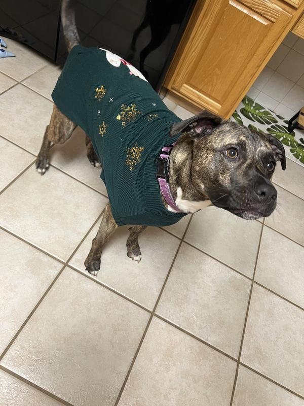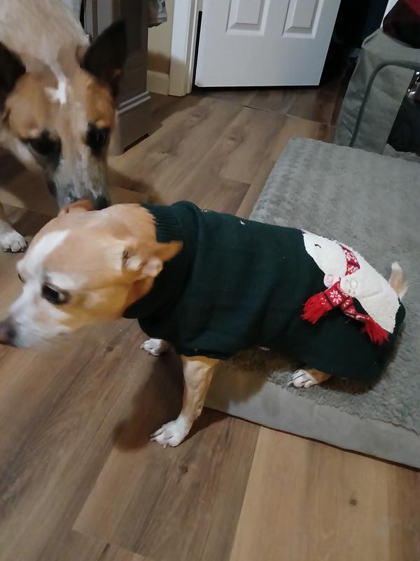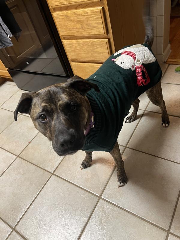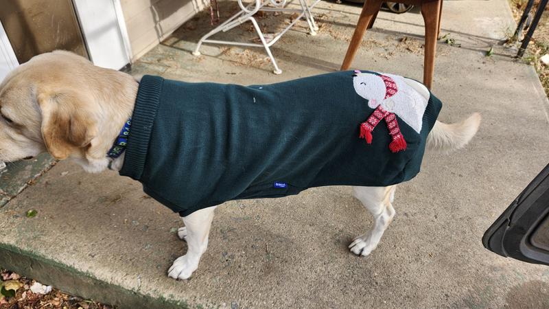 It's been hard shopping for clothes for my 95 lb American Akita since larger sizes are usually unavailable, so I was happy to see this sweater available in a XXL. It's actually a little big on him, but we'll stick to this size since I have another frisco sweater in a large that is too tight for him. The green color is perfect for the holidays and the polar bear sticking his tongue out is too cute. My only concern is that the bear's scarf dangles out from the sweater and I expect that to get destroyed by his little brother when they play