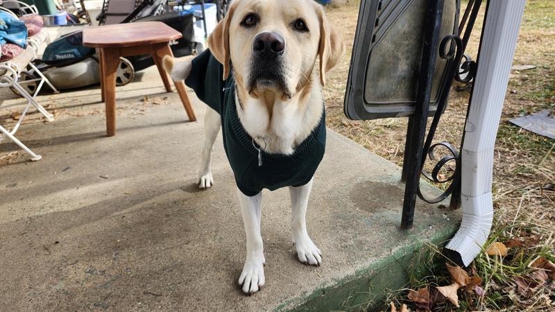 I ordered the xxl for my 72 lb (almost) 3yr old yellow lab knowing that it would be a little loose on him, he doesn't like tight fitting snug clothes/sweaters- and gets uncomfortable in them fast if they're too snug.And him being a lab, he honestly doesnt 'need' to wear anything to keep warm - but he just looks so adorable/ handsome in sweaters - so he usually only wears them for a short amount of time in cold weather and wearing this sweater he had gotten lots of compliments and extra pets on his walks. Since I ordered the larger size, he was comfortable in it and I must say very handsome even though he could have fit in an xl.