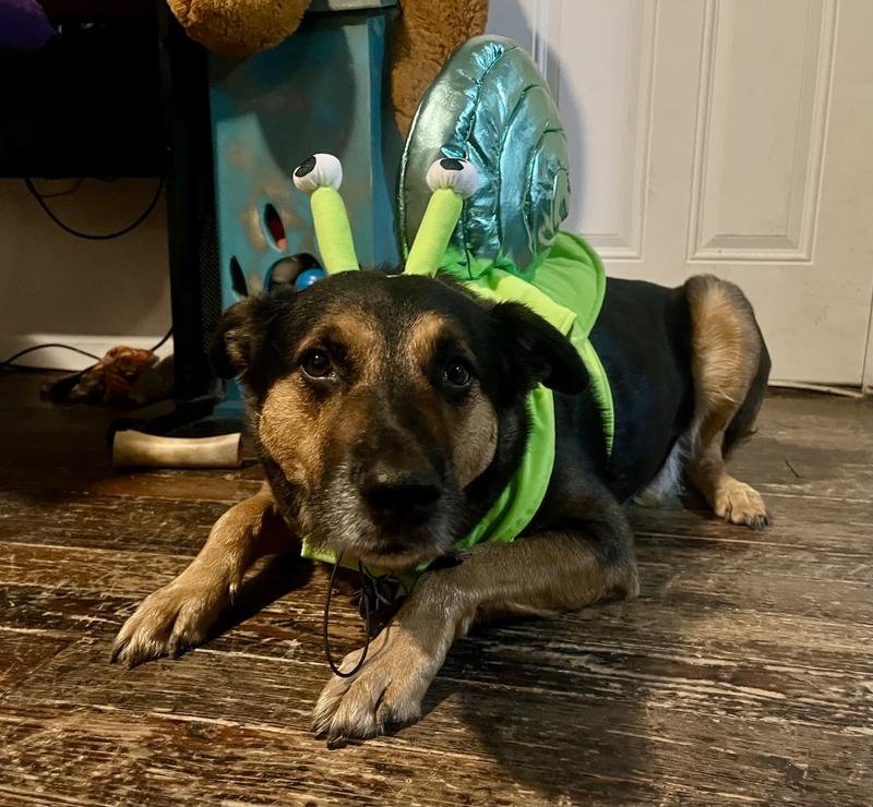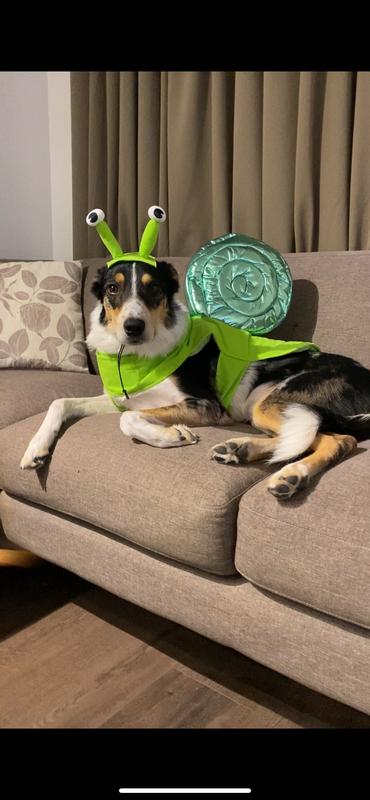 I took this snail costume and stitched it onto a green harness to make it more functional for my Labrador. Then I added some disco fabric to it so she could shine as a disco snail! Very happy with my purchase. It turned out so cute! And I’m also impressed with the antennas they stay on way better than I was expecting.