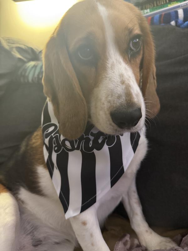 Cute bandana for the sports enthusiast. Your pet can cheer along with you for your team dressed for the occasion. Stain resistant and easy to clean. Would be nice if there were options for different colors. But Black/White is a classic combo.