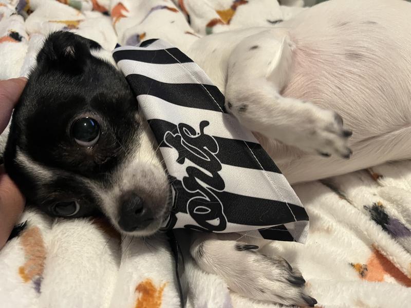 There has never been a more appropriate accessory for our household! We were really impressed by the material used for this bandana. Having a crazy puppy, she bit