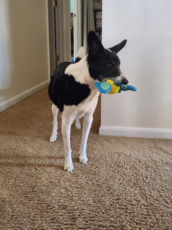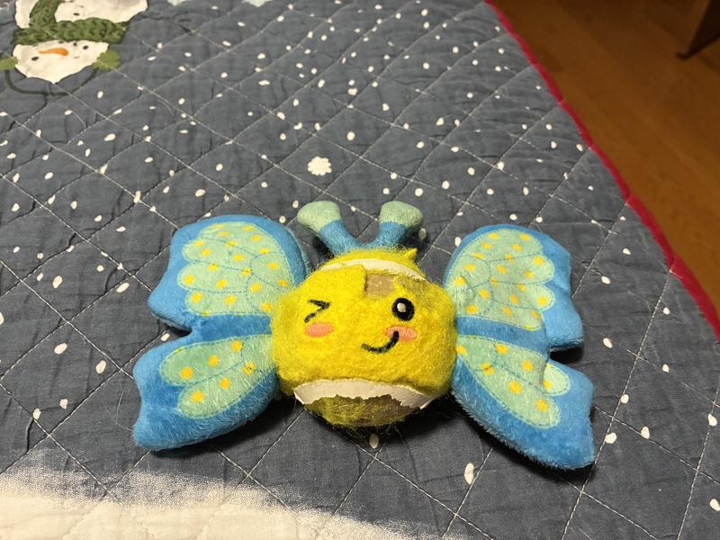 Love this toy. It’s small enough for them, has crinkles sounding butterfly wings which is great for interest. Plus the colors are vibrant which is always a plus to keep dogs focused