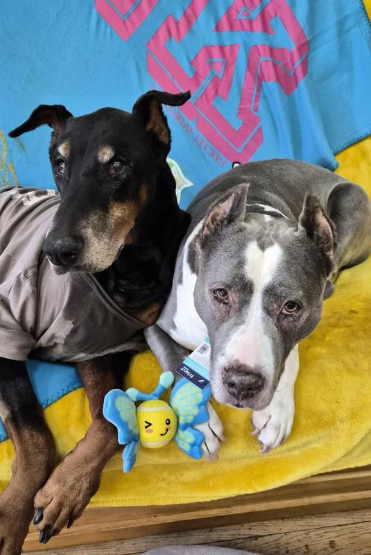 I need to get more! We little had a battle royal going on. As soon as all 4 of my dogs saw it and heard the squeaker they stole it from one another! LOL. It's been rainy and yucky outside so the Frisco Squeaky Butterfly for inside was just the thing they needed to expend some of that couped up energy. The colors are nice and bright. The crinkly wings were a favorite surprise of my Mini Pin and Terrier mix. Once the Corgi got a chance to play with it, she was tossing it up in the air. The Brindle loved biting on the tennis ball to make it squeak driving the others wild as she ran away with it. Not only were the dogs entertained , we were also while watching the tug-o-wars and stealing back and forth. What a great afternoon it was.