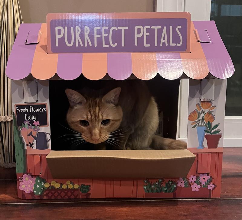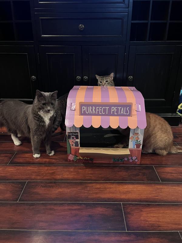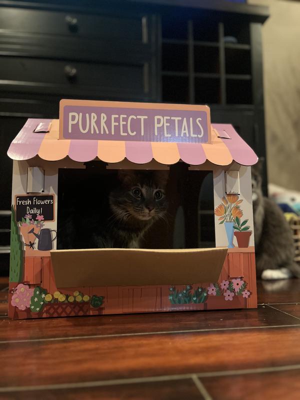 • This cardboard cathouse features the vibrant designs of a flower shop, with a look out window to allow the opportunity for adorable photos.