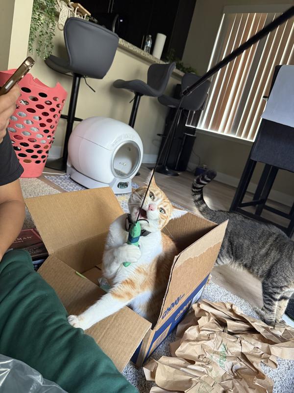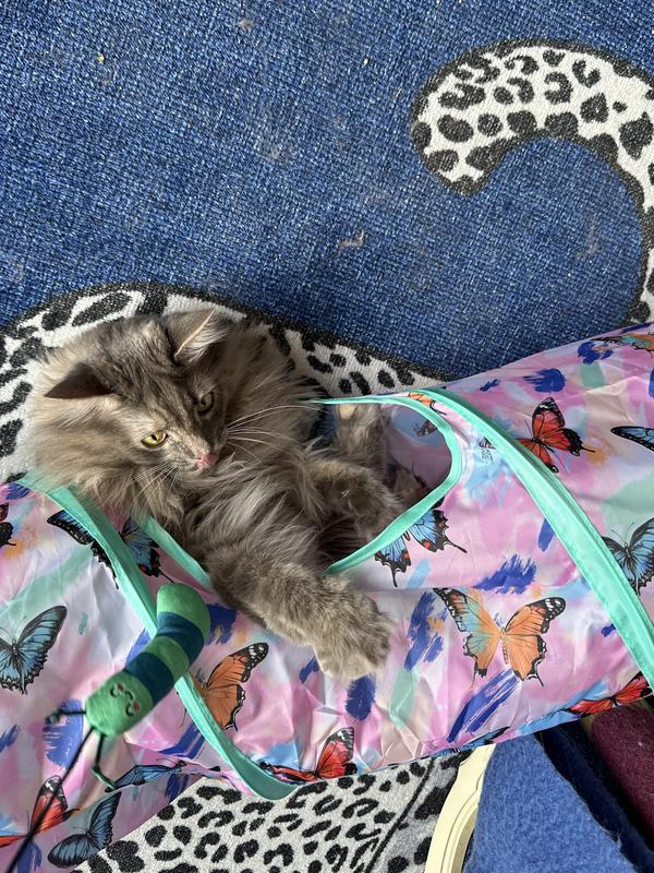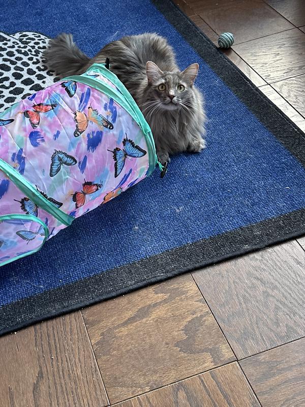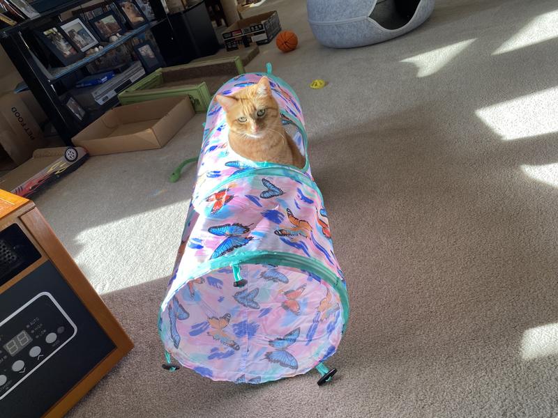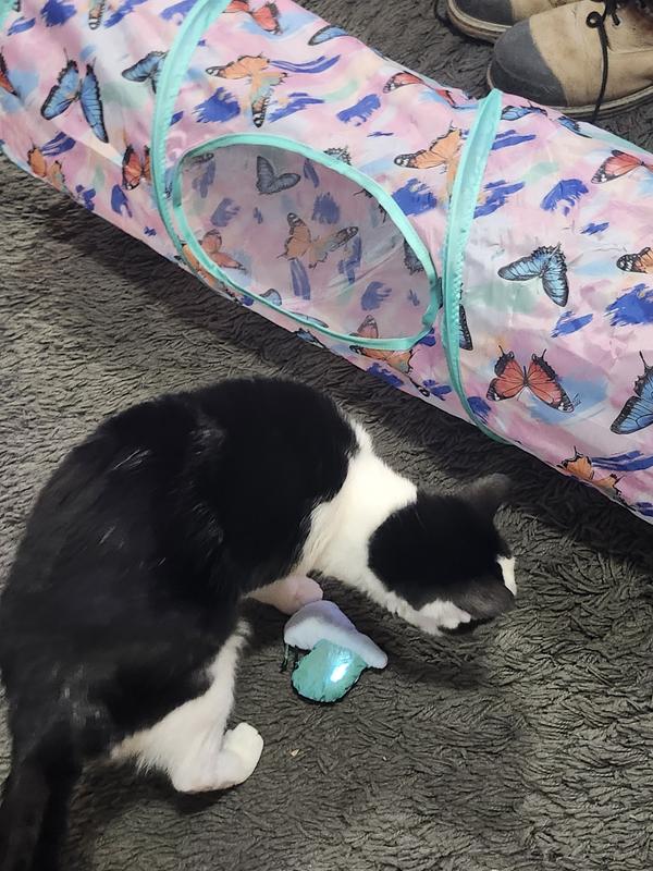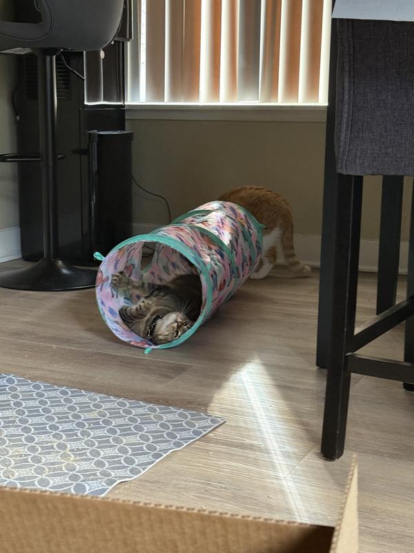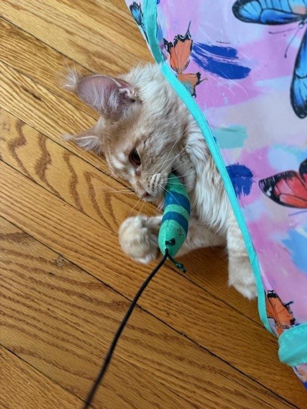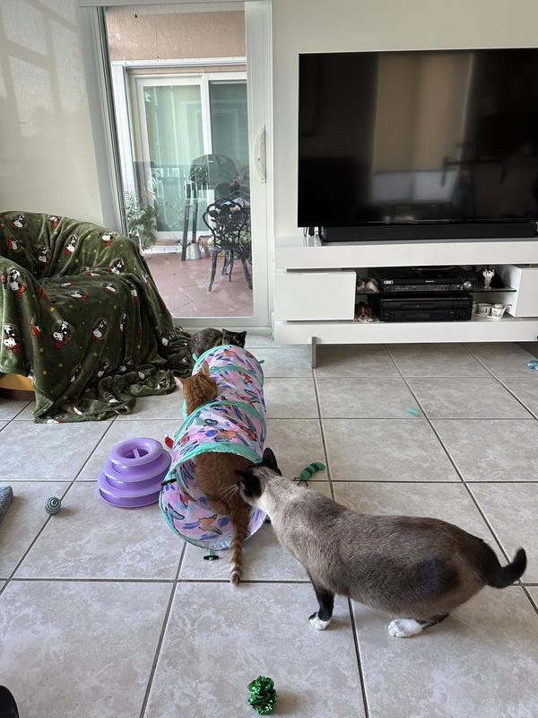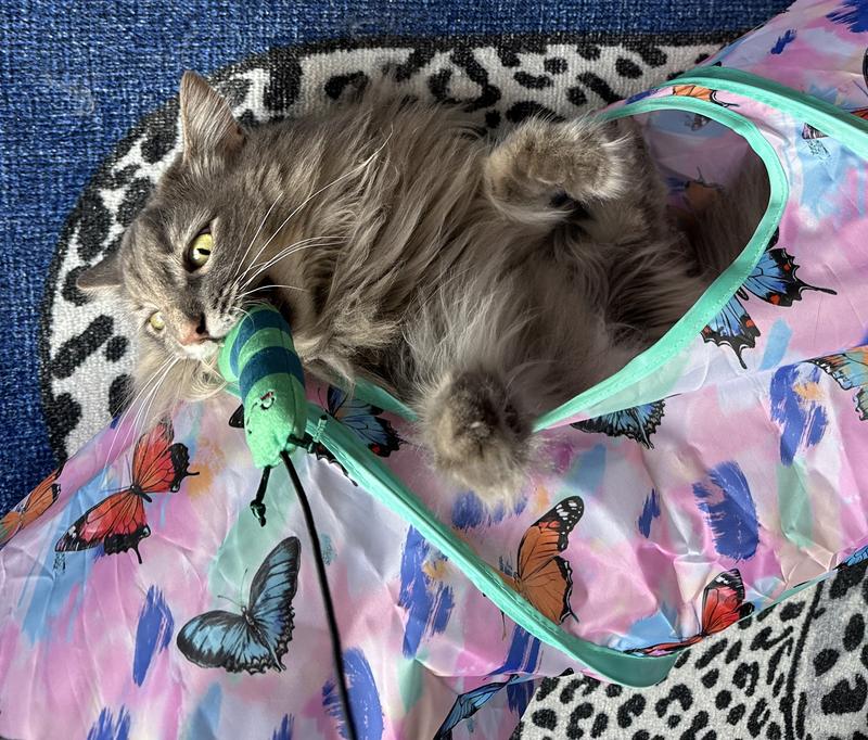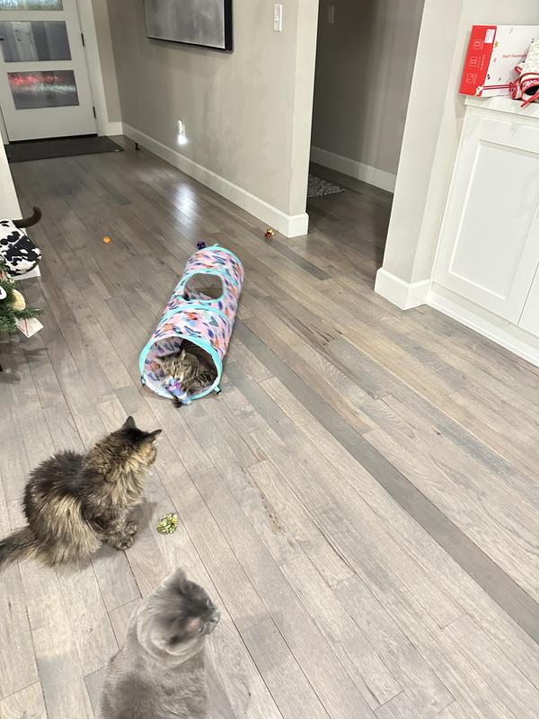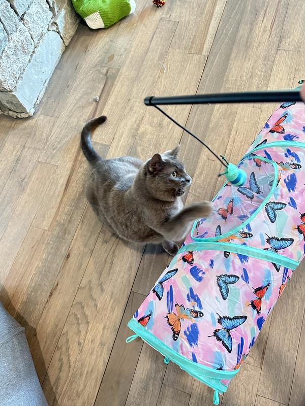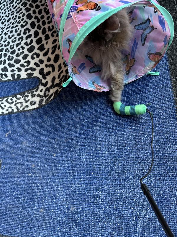 To be honest, I was very skeptical about this tunnel and toy set. I’ve have had cat tunnels in the past, but after my cats hit a certain age, they just stopped playing with them (all are 14+, with one at 20). I gave it my best cat mom try, and to my surprise, two of my cats turned back time and started playing in the tunnel when I threw some of the toys in the top hole to entice them. I’m wondering if the size adds some interest? It is much shorter than the ones I had before (32”). They like to run through the tunnel and skid, and especially like to chase the toys through the tunnel to the other end—it’s quite hilarious. One are the cats loving the tunnel is my overweight kitty that has asthma…go figure. Maybe this will start a trend for her for a healthy 2026! As for the toy on a wand, the cats like to chase it, but my back suffers because the string portion is so short and I have to bend over and drag it on the floor while they’re chasing me (I know, I know…suck it up already…but seriously, all the cats love to chase this thing, and I have a longer version that doesn’t require as much physical activity on my part). As a compromise, I use the wand toy with the tunnel and drop it in the top hole like I’m trying to catch a fish, which the cats think is pretty cool. So, win win without the back pain.