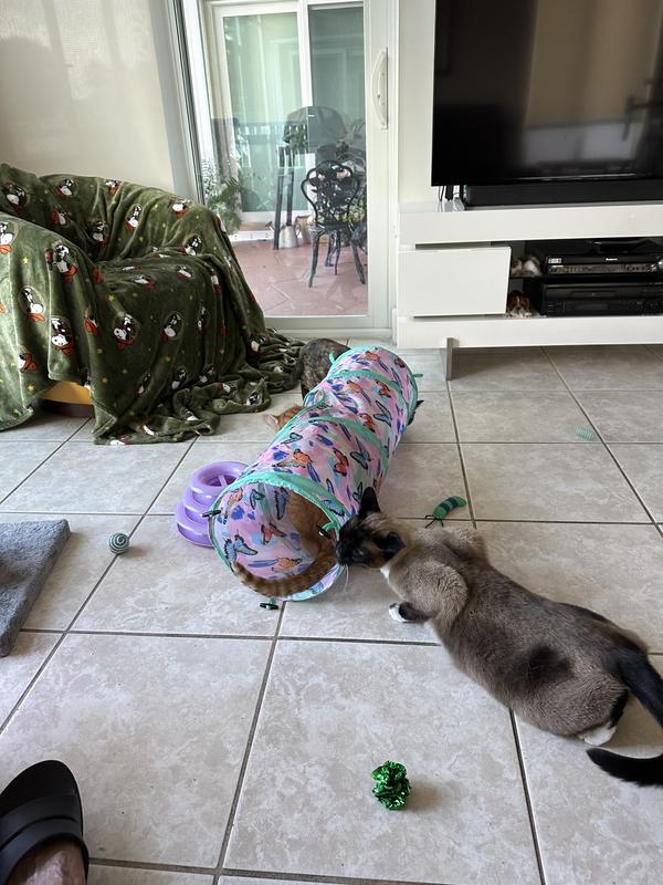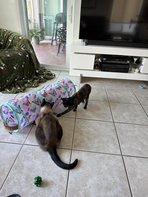 I had no idea that cats would play with a cat tunnel. I have had cats since I was 3 years old and I won't tell you how old I am now, but 4 of my cats love this tunnel. They play in it every day. One day it is in the dining room, another day it is in the kitchen and sometimes it is in the hallway because they drag it all over the place. Miss Kitty thinks the tunnel is the route to her cat bed, so she goes through it most every time she wants to lay in her cat bed. I have 5 cats, but Stormy is 14 years old and was a feral cat that came through our patio fence when she was 6 weeks old. Since we have had her, she never plays with anything. Not sure why, but she did not join in this fun and the other 4 of my cats are still having fun dragging these toys and tunnel all over the place. Houdini loves to play with Dillon and Miss Kitty in the Tunnel and Lexi wants to use the tunnel when no one else is in there. Lexi and Houdini are both 20-pound Ragdolls and they easily fit in this tunnel which is 9 inches in diameter. Miss Kitty loves those crinkle balls, and she grabbed that toy right away and carried it everywhere for days. She has other crinkle balls, but this one was special because she took it everywhere she went, even when she took a nap. Dillon, he loved all the toys. This package with the tunnel and all the toys is great and I took a hundred and one photos, but you only give space for 6 and it was hard to choose which ones to put in this review. They all are having so much fun with these toys that we have to stop what we are doing just to watch them play because not only do they drag the toys around, but they toss them in the air and then run after them just to do it again.