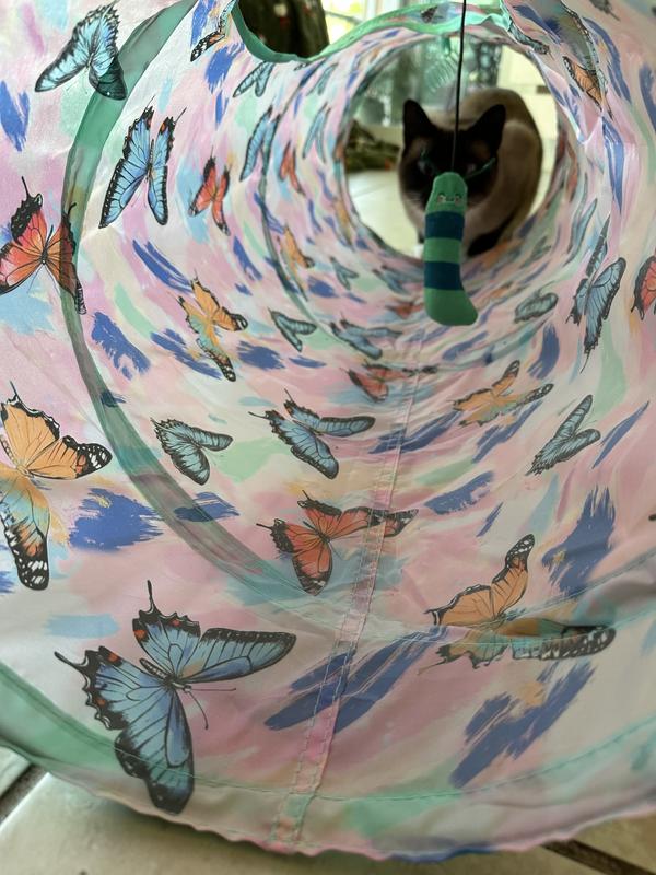 My 4 year old Maine Coon is still very kittenish and she went crazy for this tunnel and all the toys inside, especially the worm on the stick! I love that she plays with the tunnel and toys even when I'm not with her, so it keeps her entertained when i'm not home. Plus the butterfly pattern is really pretty and its well made. Somethimes she even sleeps inside the tunnel.